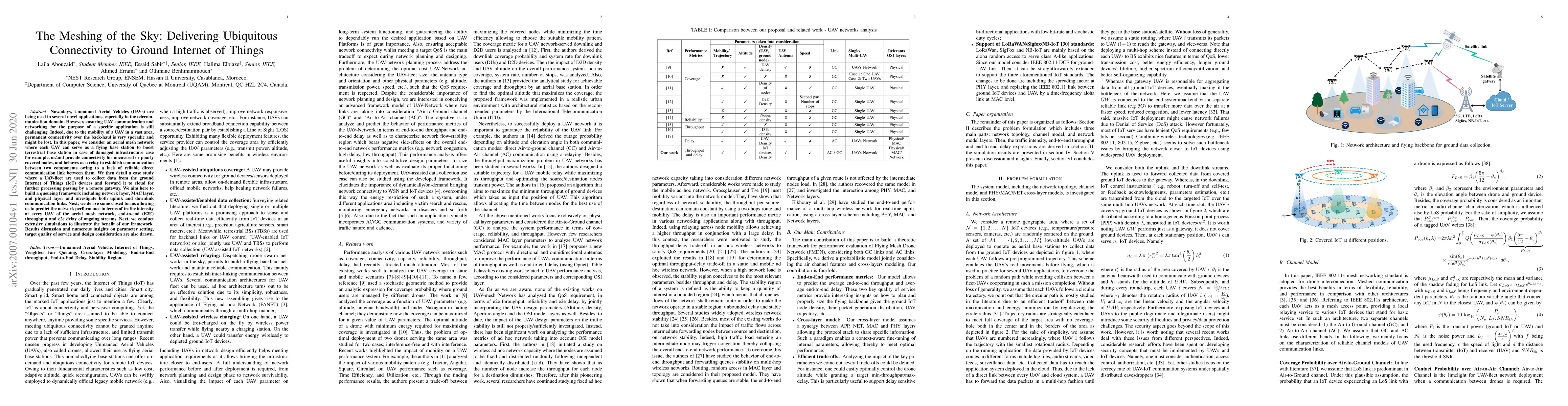 Nowadays, Unmanned Aerial Vehicles (UAVs) are being used in several novel applications, especially in the telecommunication domain. However, ensuring UAV communication and networking for the purpose of a specific application is still challenging. Indeed, due to the mobility of a UAV in a vast area, permanent connectivity over the back-haul is very sporadic and might be lost. In this paper, we consider an aerial mesh network where each UAV can serve as a flying base station to boost terrestrial base station in case of damaged infrastructure case for example, or/and provide connectivity for uncovered or poorly covered nodes, and behaves as a relay to establish communication between two components owing to a lack of reliable direct communication link between them. We then detail a case study where a UAV-fleet are used to collect data from the ground Internet of Things (IoT) devices and forward it to cloud for further processing passing by a remote gateway. We aim here to build a queueing framework including network layer, MAC layer, and physical layer and investigate both uplink and downlink communication links. Next, we derive some closed forms allowing us to predict the network performance in terms of traffic intensity at every UAV of the aerial mesh network, end-to-end (E2E) throughput and e2e delay of ongoing streams. Next, we conduct extensive simulations to illustrate the benefit of our framework. Results discussion and numerous insights on parameter setting, target quality of service and design consideration are also drawn.