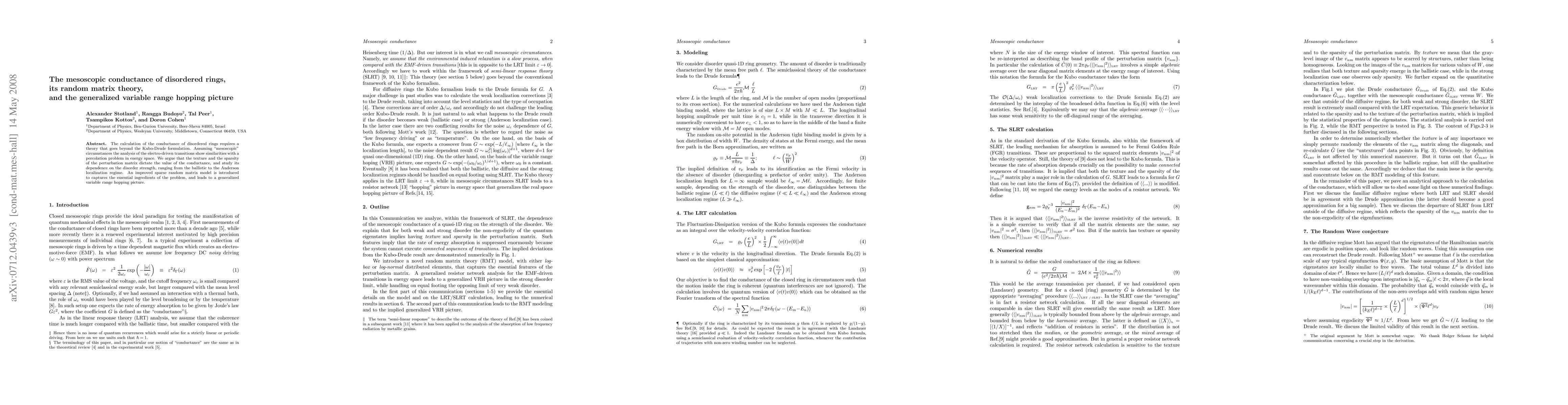 This paper investigates how disorder affects conductance in mesoscopic rings, proposing a new sparse random matrix model that captures the problem's essential ingredients and leading to a generalized variable range hopping picture.