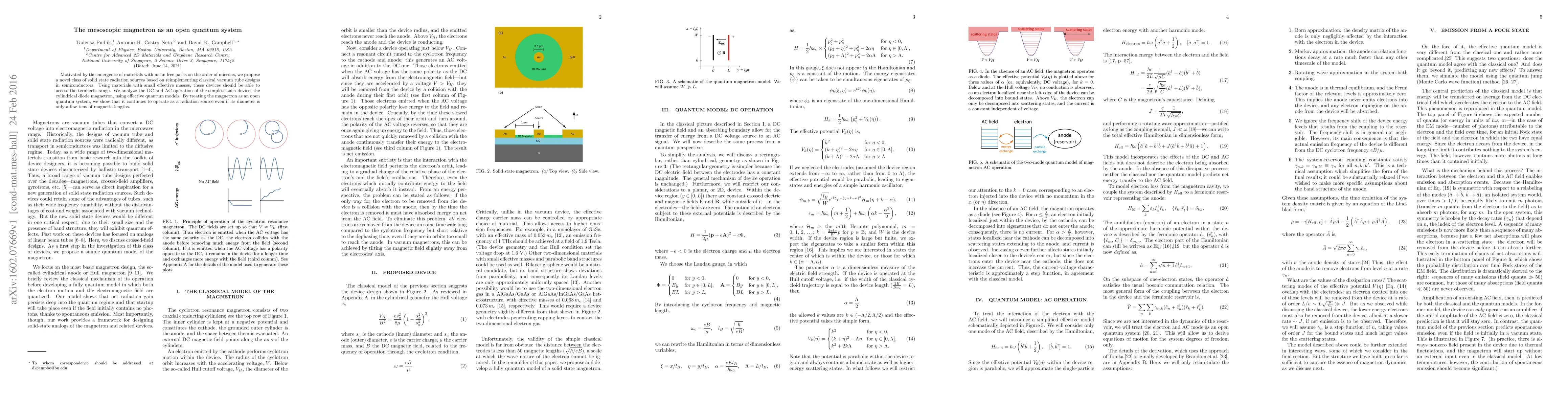 Motivated by the emergence of materials with mean free paths on the order of microns, we propose a novel class of solid state radiation sources based on reimplementing classical vacuum tube designs in semiconductors. Using materials with small effective masses, these devices should be able to access the terahertz range. We analyze the DC and AC operation of the simplest such device, the cylindrical diode magnetron, using effective quantum models. By treating the magnetron as an open quantum system, we show that it continues to operate as a radiation source even if its diameter is only a few tens of magnetic lengths.