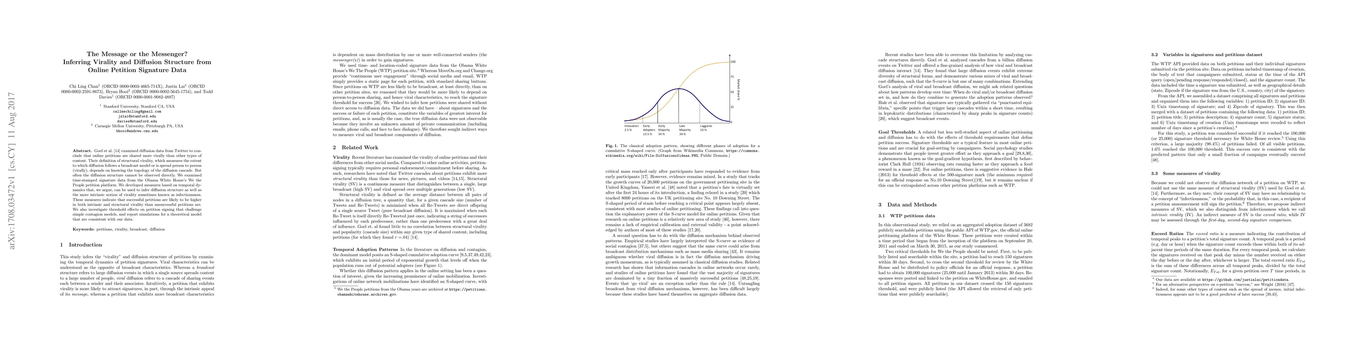 Goel et al. (2016) examined diffusion data from Twitter to conclude that online petitions are shared more virally than other types of content. Their definition of structural virality, which measures the extent to which diffusion follows a broadcast model or is spread person to person (virally), depends on knowing the topology of the diffusion cascade. But often the diffusion structure cannot be observed directly. We examined time-stamped signature data from the Obama White House's We the People petition platform. We developed measures based on temporal dynamics that, we argue, can be used to infer diffusion structure as well as the more intrinsic notion of virality sometimes known as infectiousness. These measures indicate that successful petitions are likely to be higher in both intrinsic and structural virality than unsuccessful petitions are. We also investigate threshold effects on petition signing that challenge simple contagion models, and report simulations for a theoretical model that are consistent with our data.