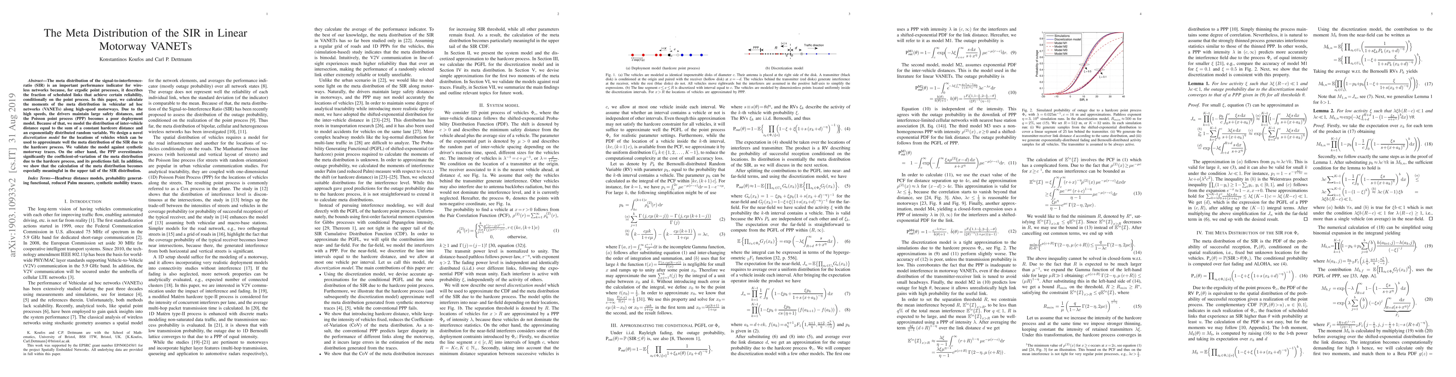 The meta distribution of the signal-to-interference-ratio (SIR) is an important performance indicator for wireless networks because, for ergodic point processes, it describes the fraction of scheduled links that achieve certain reliability, conditionally on the point process. The calculation of the moments of the meta distribution requires the probability generating functional (PGFL) of the point process. In vehicular ad hoc networks (VANETs) along high-speed motorways, the Poisson point process (PPP) is a poor deployment model, because the drivers, due to the high speeds, maintain large safety distances. In this paper, we model the distribution of inter-vehicle distance equal to the sum of a constant hardcore distance and an exponentially distributed random variable. We design a novel \emph{discretization model} for the locations of vehicles which can be used to approximate well the PGFL due to the hardcore point process and the meta distribution of the SIR generated from synthetic motorway traces. On the other hand, the PPP overestimates significantly the coefficient-of-variation of the meta distribution due to the hardcore process, and its predictions fail. In addition, we show that the calculation of the meta distribution becomes especially meaningful in the upper tail of the SIR distribution.