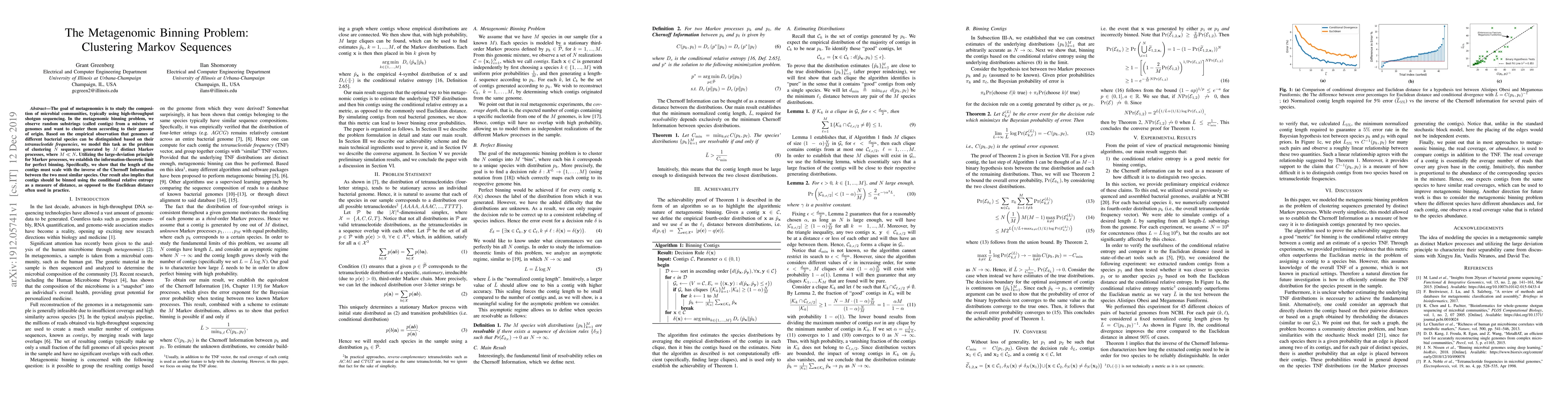 This paper addresses the metagenomic binning problem, focusing on clustering contigs from mixed microbial genomes using tetranucleotide frequency analysis. It establishes the information-theoretic limit for perfect binning, showing that contig length must scale inversely with the Chernoff Information between species, and recommends conditional relative entropy over Euclidean distance for binning.