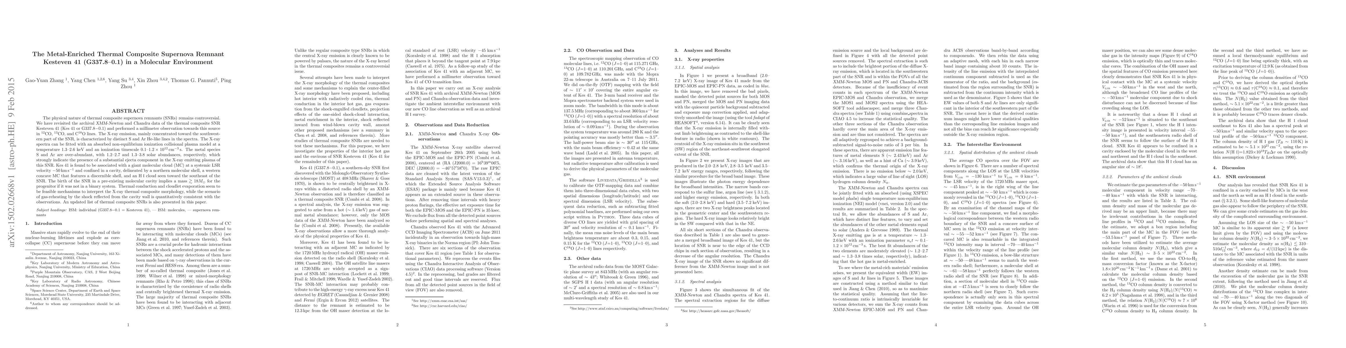 This paper revisits the thermal composite supernova remnant Kes 41 (G337.8-0.1), revealing its metal-enriched X-ray emission and association with a giant molecular cloud. The X-ray spectra indicate substantial ejecta components, suggesting a progenitor mass of at least 18 solar masses, and propose thermal conduction and cloudlet evaporation as plausible mechanisms for its composite morphology.