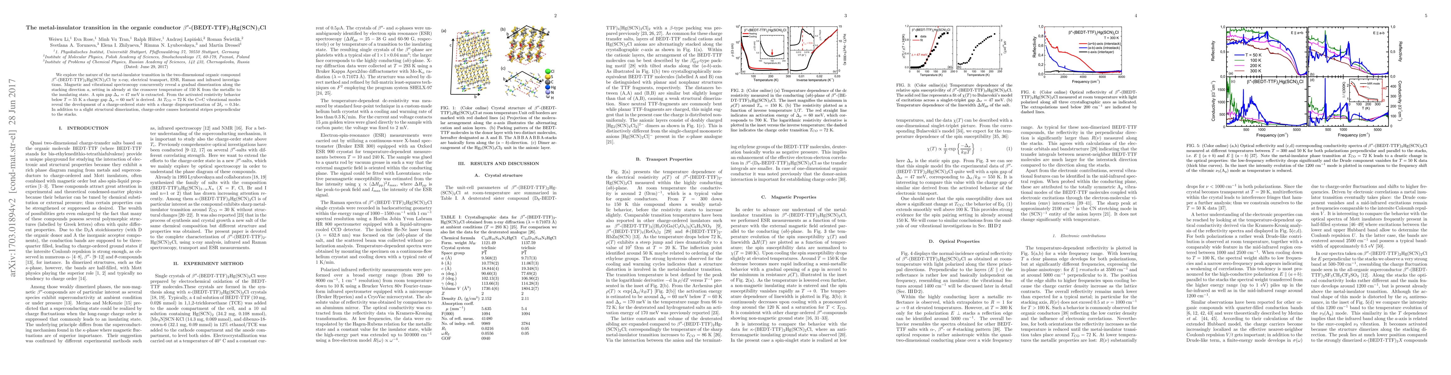 We explore the nature of the metal-insulator transition in $\beta^{\prime\prime}$-(BEDT-TTF)$_{2}$Hg(SCN)$_{2}$Cl by x-ray, electrical transport, ESR, Raman and infrared investigations. Magnetic and vibrational spectroscopy concurrently reveal a gradual dimerization along the stacking direction $a$, setting in already at the crossover temperature of 150K from the metallic to the insulating state. A spin gap $\Delta_\sigma = 47$meV is extracted. From the activated resistivity behavior below 55K a charge gap $\Delta_\rho=60$meV is derived. At $T_{\rm CO} = 72$K the C=C vibrational modes reveal the development of a charge-ordered state with a charge disproportionation of $2\delta_{\rho}=0.34e$