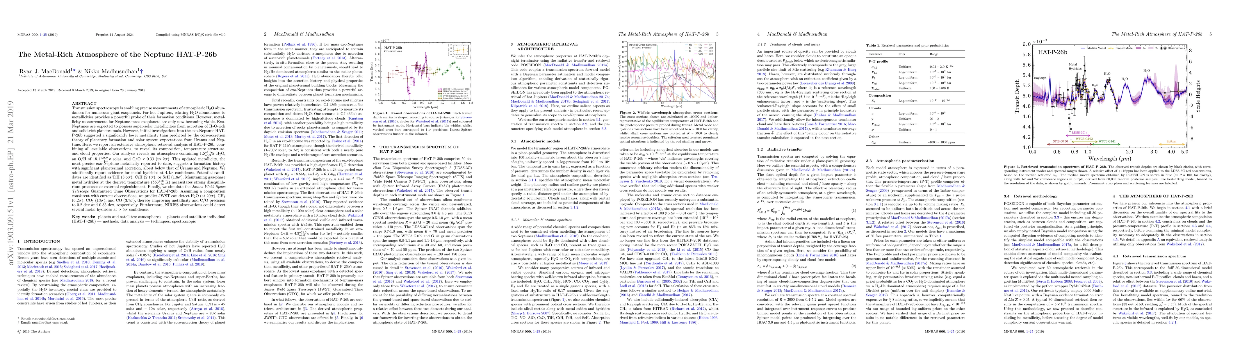 Transmission spectroscopy is enabling precise measurements of atmospheric H2O abundances for numerous giant exoplanets. For hot Jupiters, relating H2O abundances to metallicities provides a powerful probe of their formation conditions. However, metallicity measurements for Neptune-mass exoplanets are only now becoming viable. Exo-Neptunes are expected to possess super-solar metallicities from accretion of H2O-rich and solid-rich planetesimals. However, initial investigations into the exo-Neptune HAT-P-26b suggested a significantly lower metallicity than predicted by the core-accretion theory of planetary formation and solar system expectations from Uranus and Neptune. Here, we report an extensive atmospheric retrieval analysis of HAT-P-26b, combining all available observations, to reveal its composition, temperature structure, and cloud properties. Our analysis reveals an atmosphere containing 1.5(+2.1)(-0.9)% H2O, an O/H of 18.1(+25.9)(-11.3)x solar, and C/O < 0.33 (to 2$\sigma$). This updated metallicity, the most precise exo-Neptune metallicity reported to date, suggests a formation history with significant planetesimal accretion, albeit below that of Uranus and Neptune. We additionally report evidence for metal hydrides at 4.1$\sigma$ confidence. Potential candidates are identified as TiH (3.6$\sigma$), CrH (2.1$\sigma$), or ScH (1.8$\sigma$). Maintaining gas-phase metal hydrides at the derived temperature (~560 K) necessitates strong disequilibrium processes or external replenishment. Finally, we simulate the JWST Guaranteed Time Observations for HAT-P-26b. Assuming a composition consistent with current observations, we predict JWST can detect H2O (at 29$\sigma$), CH4 (6.2$\sigma$), CO2 (13$\sigma$), and CO (3.7$\sigma$), improving metallicity and C/O precision to 0.2 dex and 0.35 dex. Furthermore, NIRISS observations could detect several metal hydrides at >5$\sigma$ confidence.