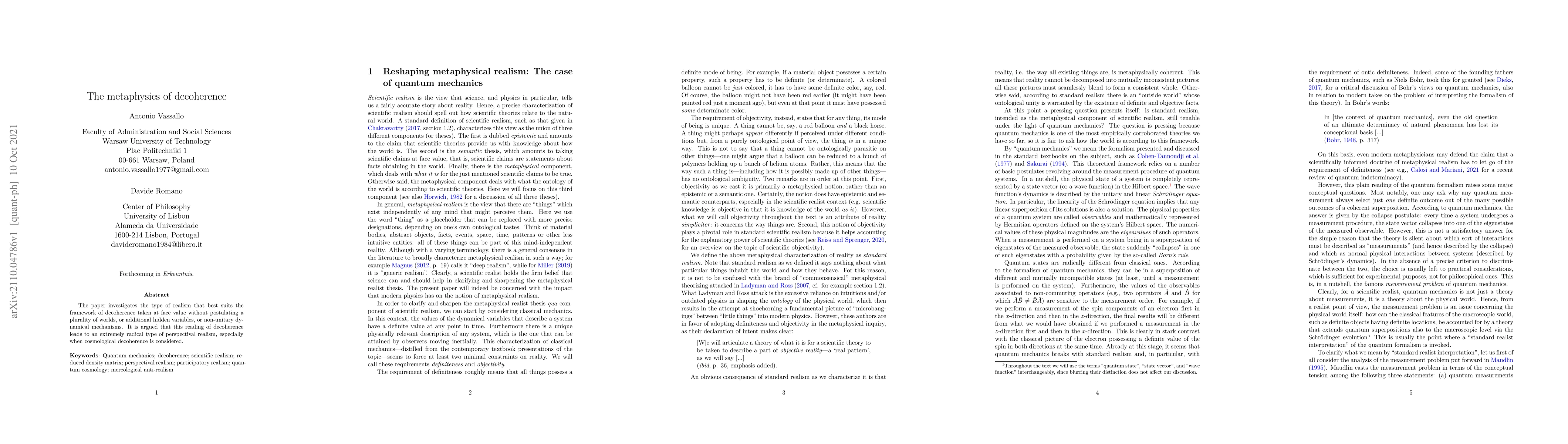 The paper investigates the type of realism that best suits the framework of decoherence taken at face value without postulating a plurality of worlds, or additional hidden variables, or non-unitary dynamical mechanisms. It is argued that this reading of decoherence leads to an extremely radical type of perspectival realism, especially when cosmological decoherence is considered.