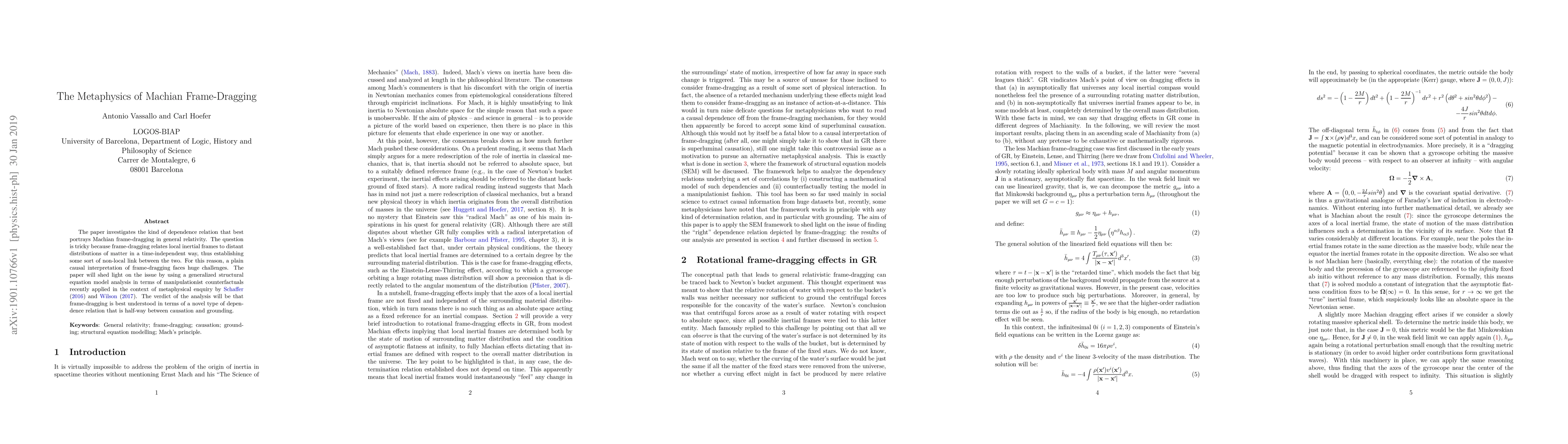 The paper explores the metaphysical nature of Machian frame-dragging in general relativity, proposing a novel dependence relation that bridges causation and grounding, rather than a straightforward causal interpretation. The analysis employs a generalized structural equation model and manipulationist counterfactuals to elucidate this complex relationship.
