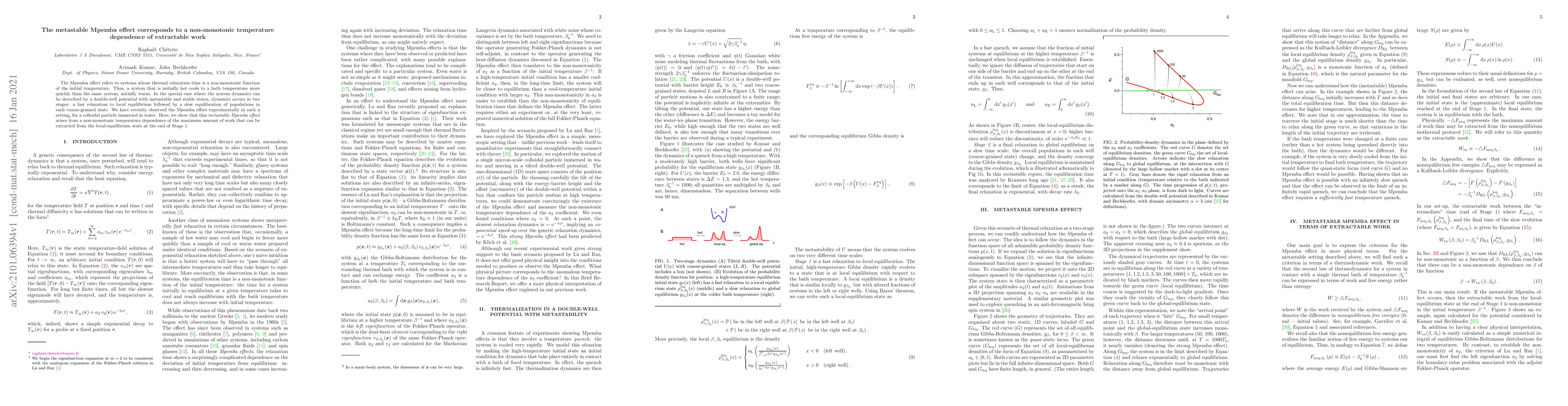 The Mpemba effect, where hotter systems cool faster than cooler ones, is observed in colloidal particles, and arises from a non-monotonic temperature dependence of extractable work from local equilibrium states. This metastable Mpemba effect highlights the complex dynamics between initial temperature and thermal relaxation.