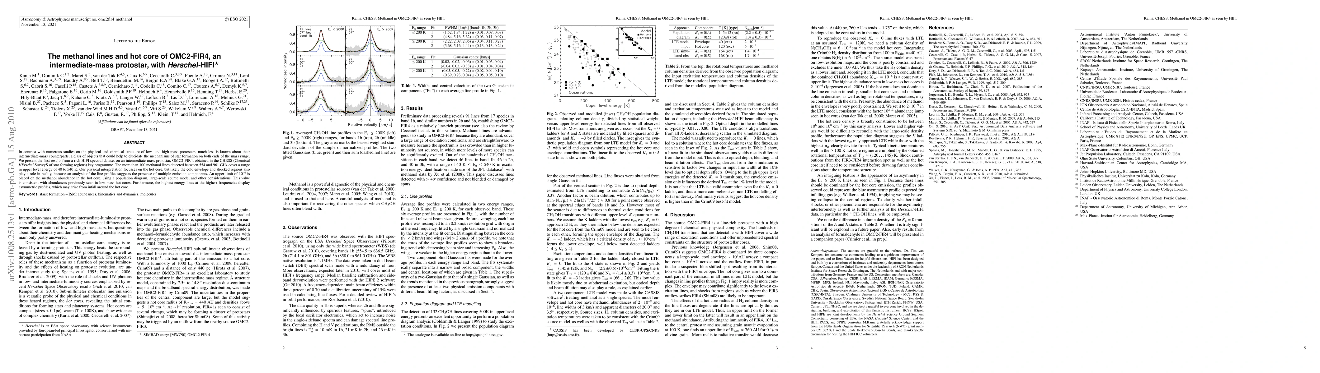 In contrast with numerous studies on the physical and chemical structure of low- and high-mass protostars, much less is known about their intermediate-mass counterparts, a class of objects that could help to elucidate the mechanisms of star formation on both ends of the mass range. We present the first results from a rich HIFI spectral dataset on an intermediate-mass protostar, OMC2-FIR4, obtained in the CHESS (Chemical HErschel SurveyS of star forming regions) key programme. The more than 100 methanol lines detected between 554 and 961 GHz cover a range in upper level energy of 40 to 540 K. Our physical interpretation focusses on the hot core, but likely the cold envelope and shocked regions also play a role in reality, because an analysis of the line profiles suggests the presence of multiple emission components. An upper limit of 10^-6 is placed on the methanol abundance in the hot core, using a population diagram, large-scale source model and other considerations. This value is consistent with abundances previously seen in low-mass hot cores. Furthermore, the highest energy lines at the highest frequencies display asymmetric profiles, which may arise from infall around the hot core.