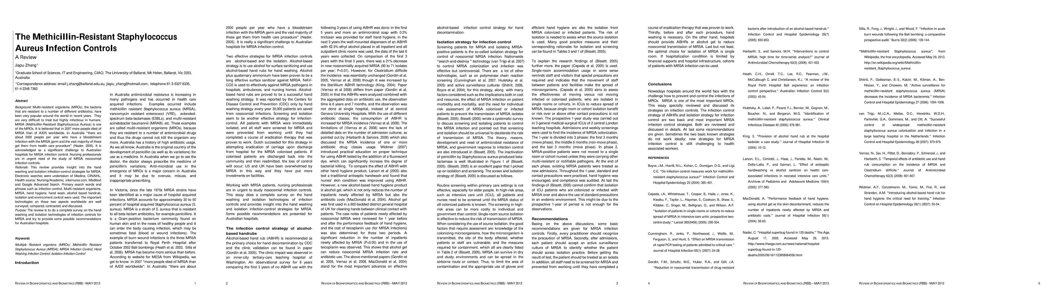 Multi-resistant organisms (MROs), the bacteria that are resistant to a number of different antibiotics, have been very popular around the world in recent years. They are very difficult to treat but highly infectious in humans. MRSA (Methicillin-Resistant Staphylococcus Aureus) is one of the MROs. It is believed that in 2007 more people died of MRSA than of AIDS worldwide. In Australia "there are about 2000 people per year who have a bloodstream infection with the MRSA germ and the vast majority of those get them from health care procedure" (Nader, 2005). It is acknowledged as a significant challenge to Australian hospitals for MRSA infection control. Nursing professionals are in urgent need of the study of MRSA nosocomial infection controls. This review provides insight into the hand washing and isolation infection-control strategies for MRSA. The important technologies on those two aspects worldwide are well surveyed, compared, contrasted, and discussed. The review is to do a complete survey on the hand washing and isolation technologies of infection controls for MRSA and try to provide some possible recommendations for Australian hospitals.