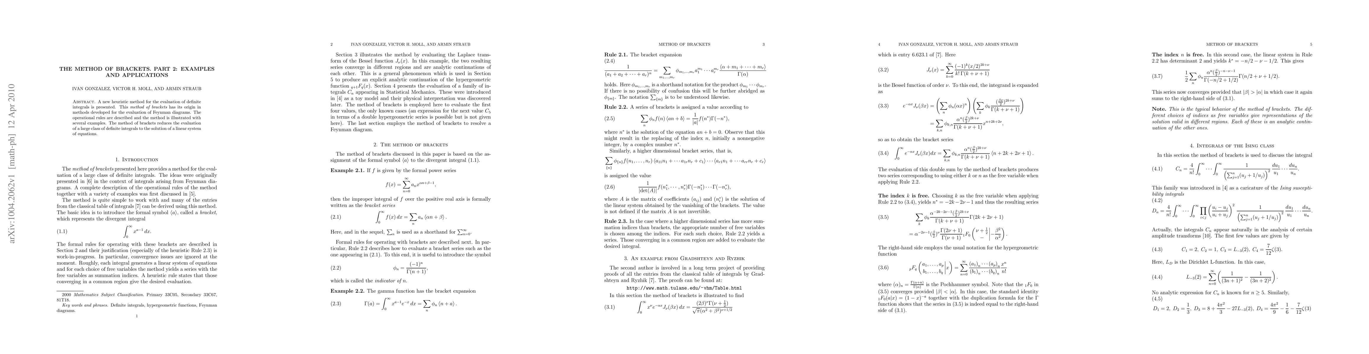 This paper introduces a heuristic method called the method of brackets for evaluating definite integrals, originating from Feynman diagrams. It simplifies the evaluation of many integrals by reducing them to solving a linear system of equations, illustrated through various examples.