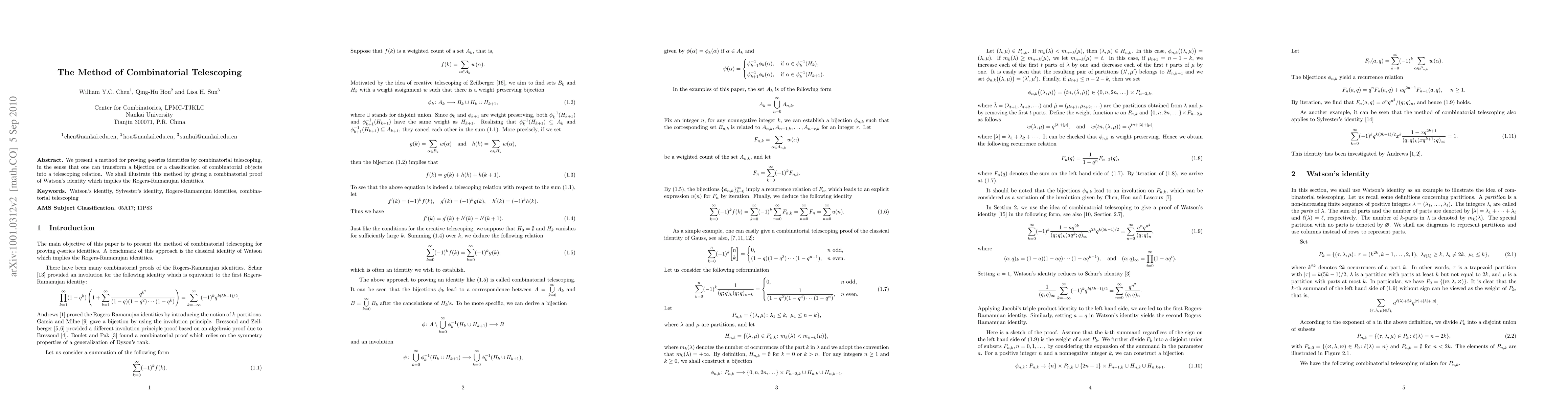 The paper introduces a combinatorial telescoping method to prove q-series identities, demonstrating its effectiveness by proving Watson's identity and subsequently the Rogers-Ramanujan identities. This technique translates combinatorial classifications into telescoping relations.