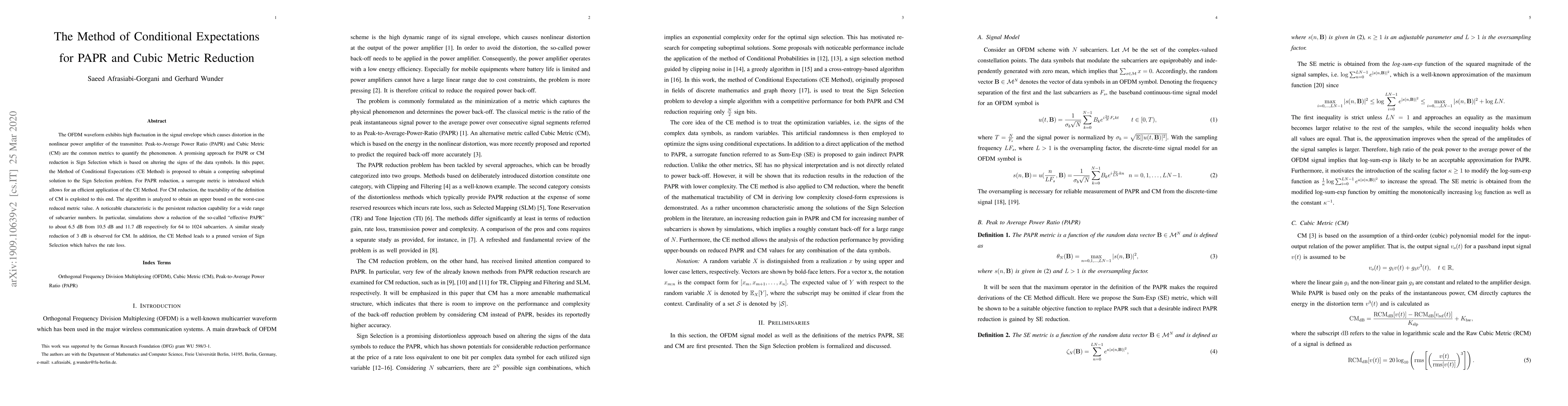 The Method of Conditional Expectations (CE Method) is proposed to reduce Peak-to-Average Power Ratio (PAPR) and Cubic Metric (CM) in OFDM waveforms, caused by high envelope fluctuations. The CE Method provides a suboptimal solution to the Sign Selection problem, with simulations showing a consistent reduction in 'effective PAPR' by about 4 dB and CM by 3 dB across a wide range of subcarrier numbers (64 to 1024). Furthermore, the CE Method results in a pruned Sign Selection version, halving the rate loss.