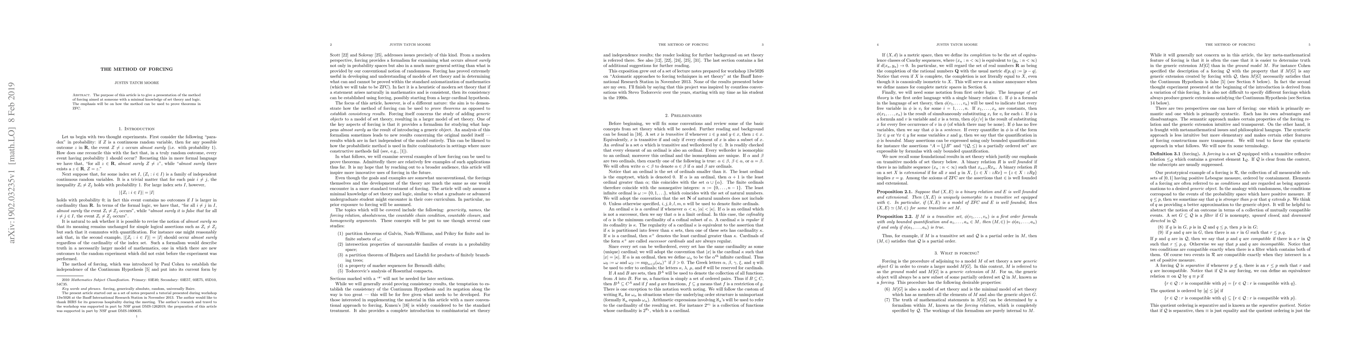 This article introduces the method of forcing for readers with minimal set theory and logic background, focusing on its application in proving theorems within the framework of Zermelo-Fraenkel set theory with the Axiom of Choice (ZFC).