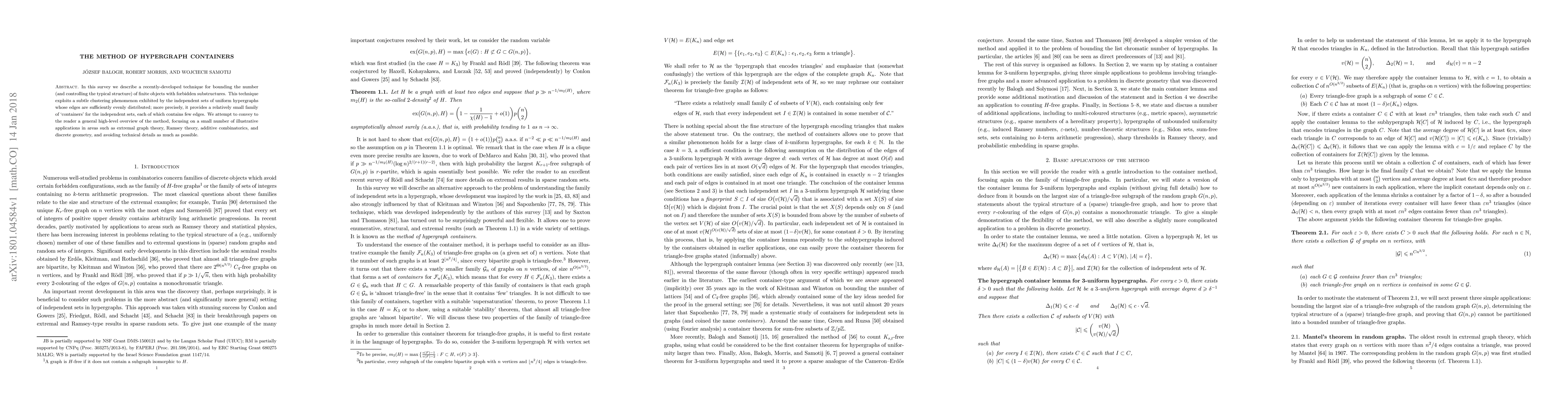 The 'method of hypergraph containers' is a new technique for bounding the number of objects with forbidden substructures, using a clustering phenomenon in uniform hypergraphs. It provides a way to control typical structures and has implications in areas like extremal graph theory and Ramsey theory.
