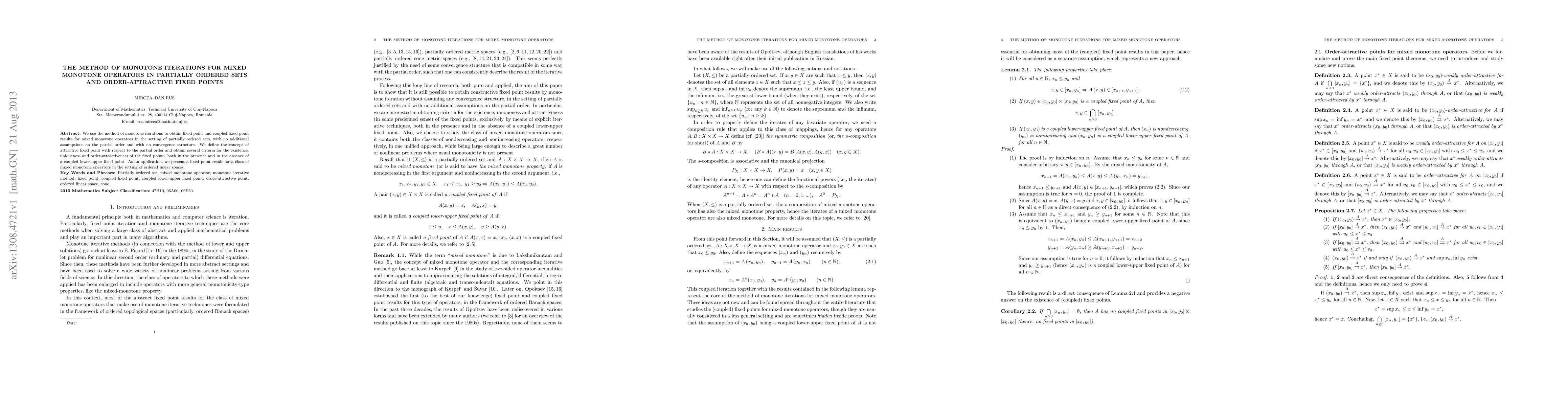 This paper employs the method of monotone iterations to find fixed points and coupled fixed points for mixed monotone operators in partially ordered sets, without requiring additional assumptions on the order or convergence structure. It introduces the concept of order-attractive fixed points and provides criteria for their existence, uniqueness, and order-attractiveness, with applications to fixed point results in ordered linear spaces.