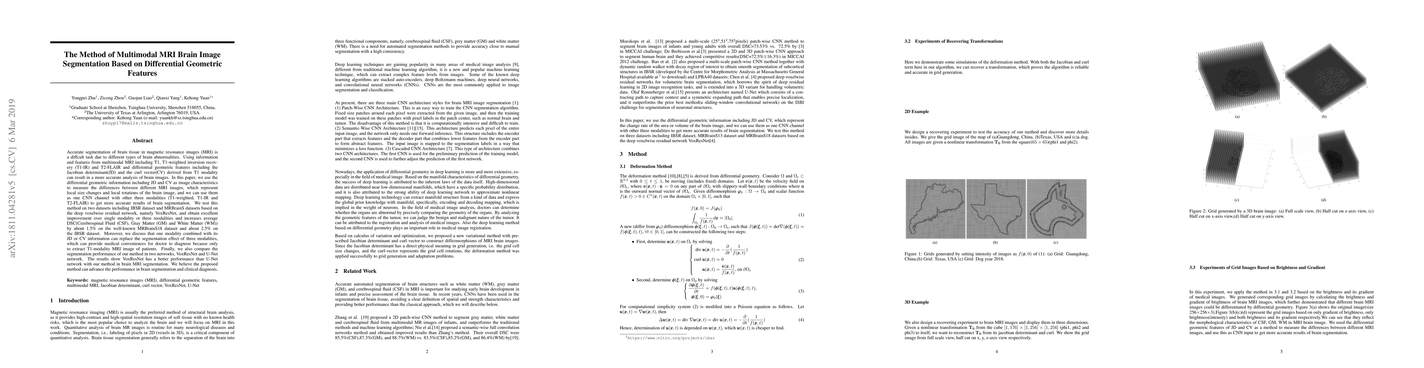 This paper proposes a multimodal MRI brain image segmentation method that integrates differential geometric features, specifically the Jacobian determinant and curl vector, with T1, T1-IR, and T2-FLAIR modalities. The method, tested on IBSR and MRBrainS datasets using VoxResNet, shows significant improvement over single or three-modality segmentations, achieving a 1.5% to 2.5% increase in average DSC. The study suggests that T1 modality combined with JD or CV can replace the three-modality approach, simplifying the diagnostic process.