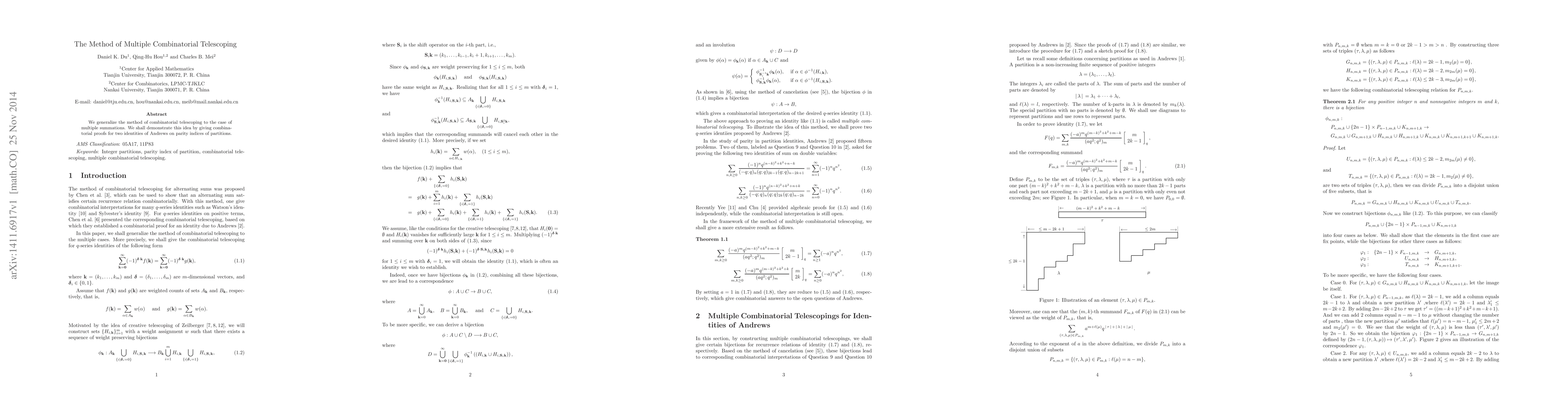 This paper extends the combinatorial telescoping method to handle multiple summations, providing combinatorial proofs for two of Andrews' identities concerning the parity indices of partitions. The work demonstrates the method's effectiveness in simplifying complex summation problems.