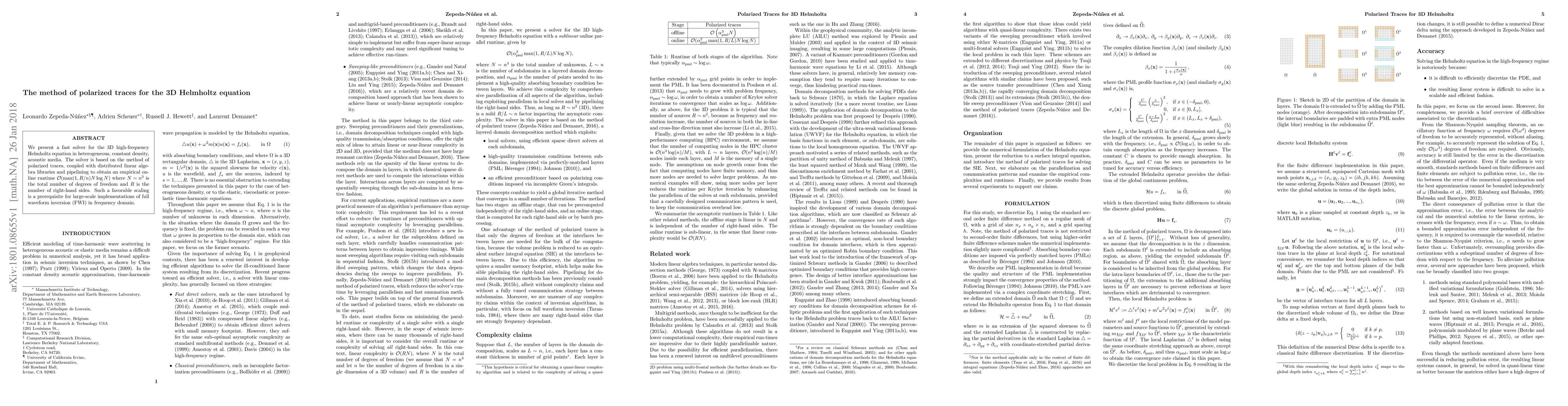 We present a fast solver for the 3D high-frequency Helmholtz equation in heterogeneous, constant density, acoustic media. The solver is based on the method of polarized traces, coupled with distributed linear algebra libraries and pipelining to obtain an empirical online runtime $ \mathcal{O}(\max(1,R/n) N \log N)$ where $N = n^3$ is the total number of degrees of freedom and $R$ is the number of right-hand sides. Such a favorable scaling is a prerequisite for large-scale implementations of full waveform inversion (FWI) in frequency domain.