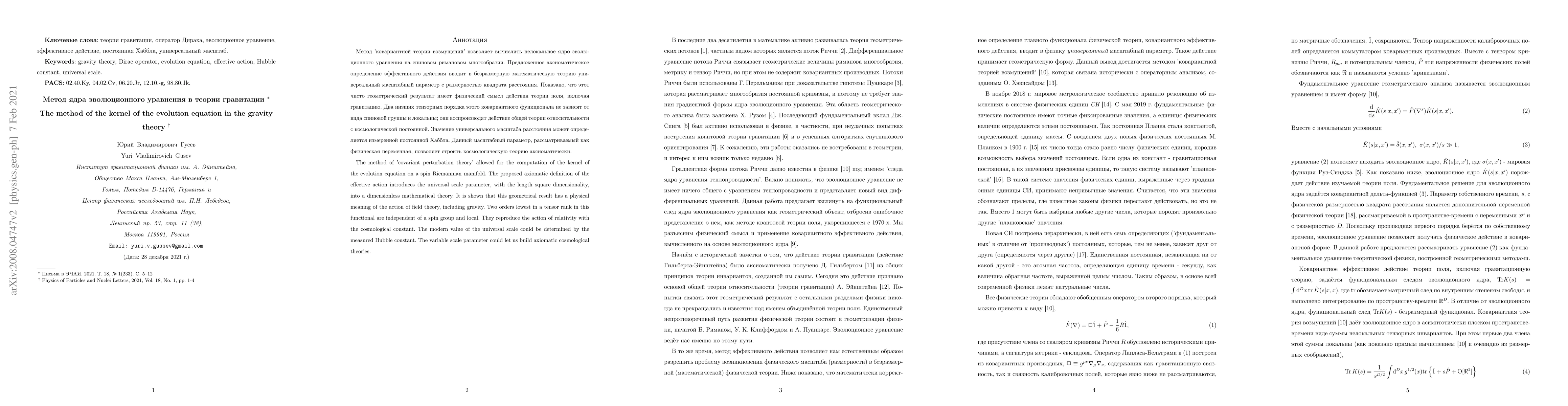 The method of 'covariant perturbation theory' allowed for the computation of the kernel of the evolution equation on a spin Riemannian manifold. The proposed axiomatic definition of the effective action introduces the universal scale parameter, with the length square dimensionality, into a dimensionless mathematical theory. It is shown that this geometrical result has a physical meaning of the action of field theory, including gravity. Two orders lowest in a tensor rank in this functional are independent of a spin group and local. They reproduce the action of relativity with the cosmological constant. The modern value of the universal scale could be determined by the measured Hubble constant. The variable scale parameter could let us build axiomatic cosmological theories.