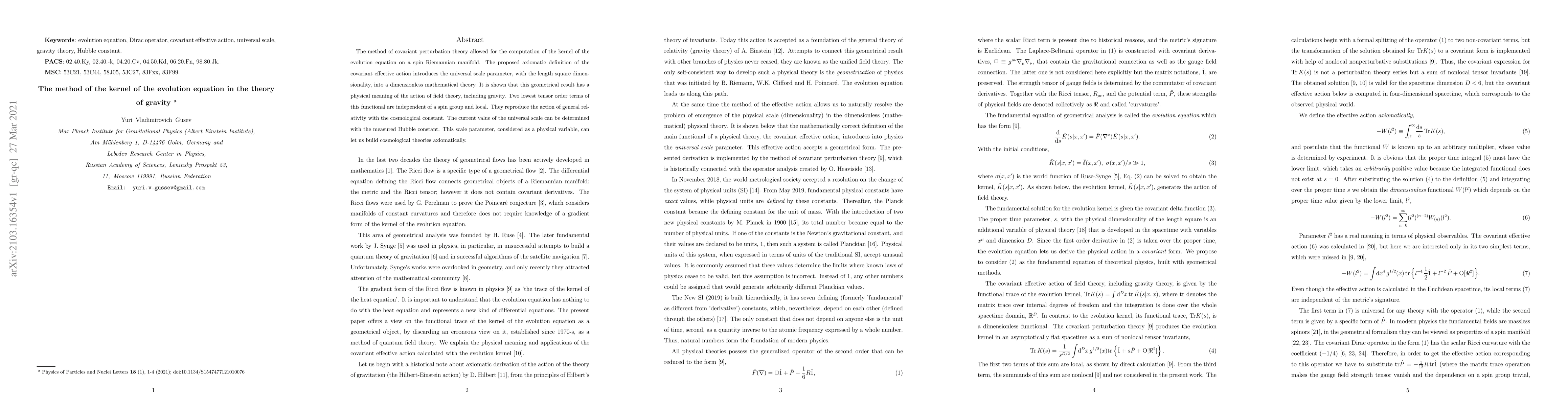 The method of covariant perturbation theory allowed for the computation of the kernel of the evolution equation on a spin Riemannian manifold. The proposed axiomatic definition of the covariant effective action introduces the universal scale parameter, with the length square dimensionality, into a dimensionless mathematical theory. It is shown that this geometrical result has a physical meaning of the action of field theory, including gravity. Two lowest tensor order terms of this functional are independent of a spin group and local. They reproduce the action of general relativity with the cosmological constant. The current value of the universal scale can be determined with the measured Hubble constant. This scale parameter considered as a physical variable can let us build cosmological theories axiomatically.