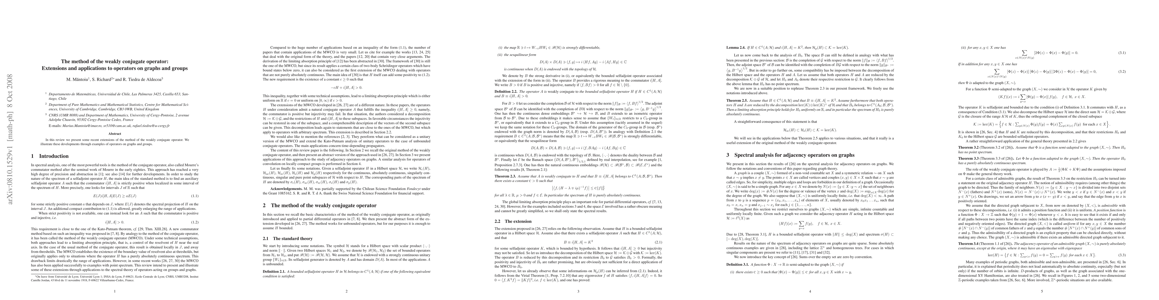 This paper reviews recent advancements in the method of the weakly conjugate operator, demonstrating its application to operators on graphs and groups with illustrative examples.