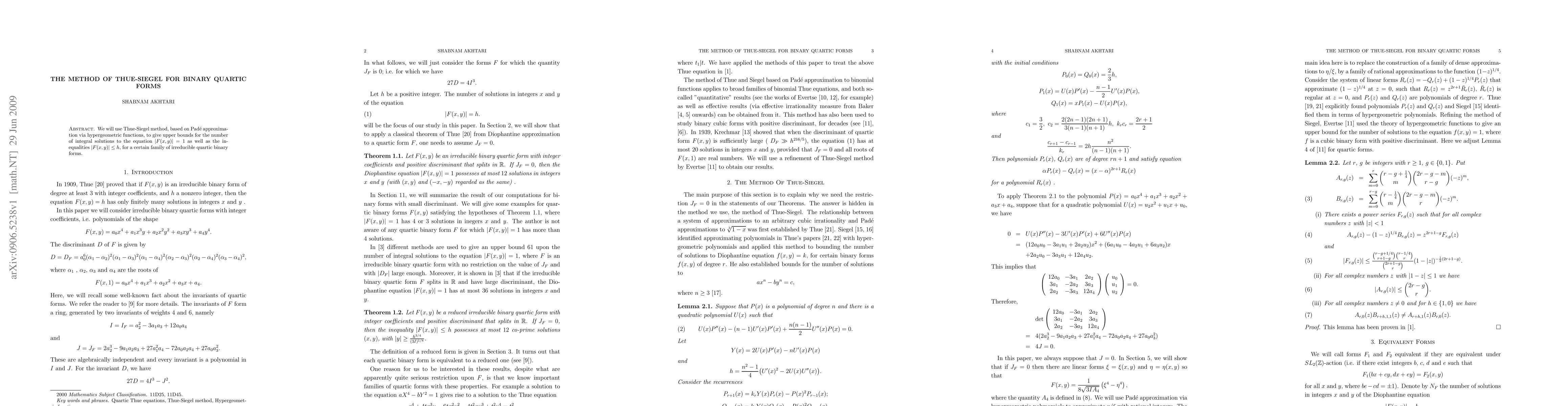 This paper employs Thue-Siegel's method, leveraging Padé approximation through hypergeometric functions, to establish upper bounds for the number of integral solutions to the equation $|F(x, y)| = 1$ and the inequalities $|F(x, y)| \leq h$ for a specific set of irreducible binary quartic forms.