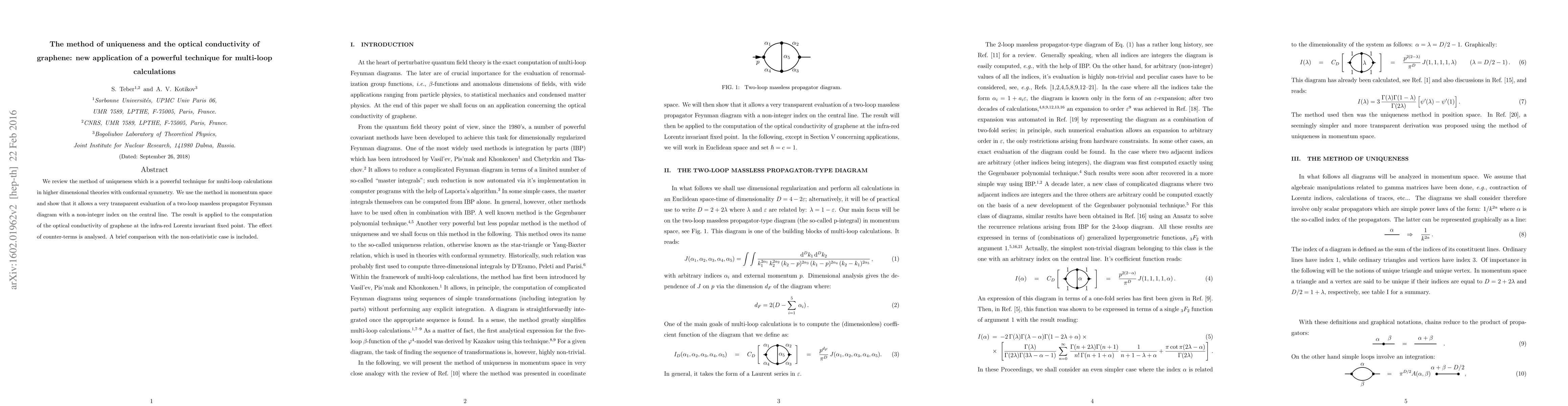 We review the method of uniqueness which is a powerful technique for multi-loop calculations in higher dimensional theories with conformal symmetry. We use the method in momentum space and show that it allows a very transparent evaluation of a two-loop massless propagator Feynman diagram with a non-integer index on the central line. The result is applied to the computation of the optical conductivity of graphene at the infra-red Lorentz invariant fixed point. The effect of counter-terms is analysed. A brief comparison with the non-relativistic case is included.