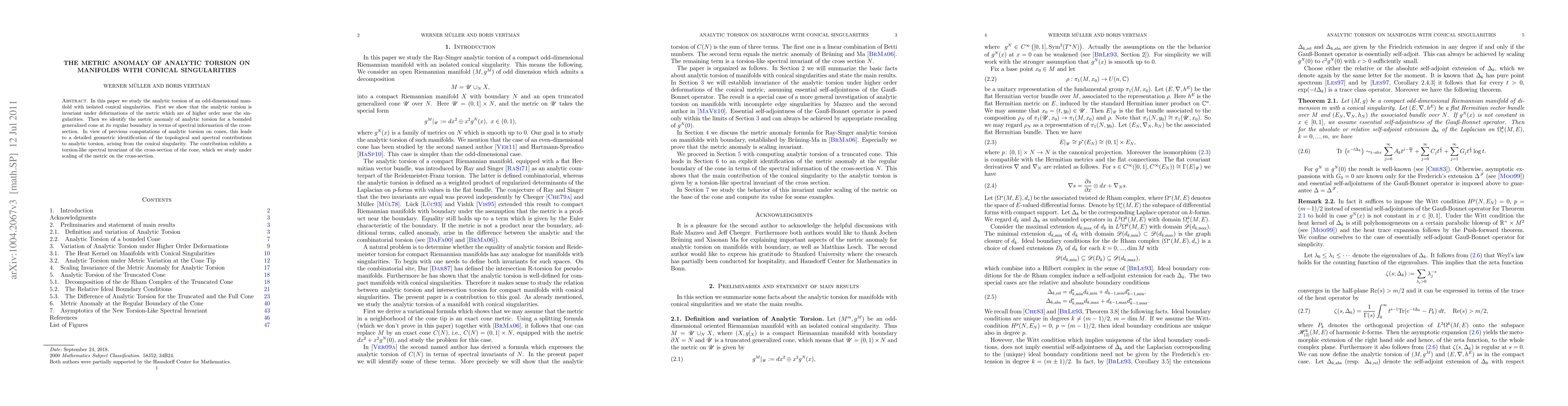 In this paper we study the analytic torsion of an odd-dimensional manifold with isolated conical singularities. First we show that the analytic torsion is invariant under deformations of the metric which are of higher order near the singularities. Then we identify the metric anomaly of analytic torsion for a bounded generalized cone at its regular boundary in terms of spectral information of the cross-section. In view of previous computations of analytic torsion on cones, this leads to a detailed geometric identification of the topological and spectral contributions to analytic torsion, arising from the conical singularity. The contribution exhibits a torsion-like spectral invariant of the cross-section of the cone, which we study under scaling of the metric on the cross-section.