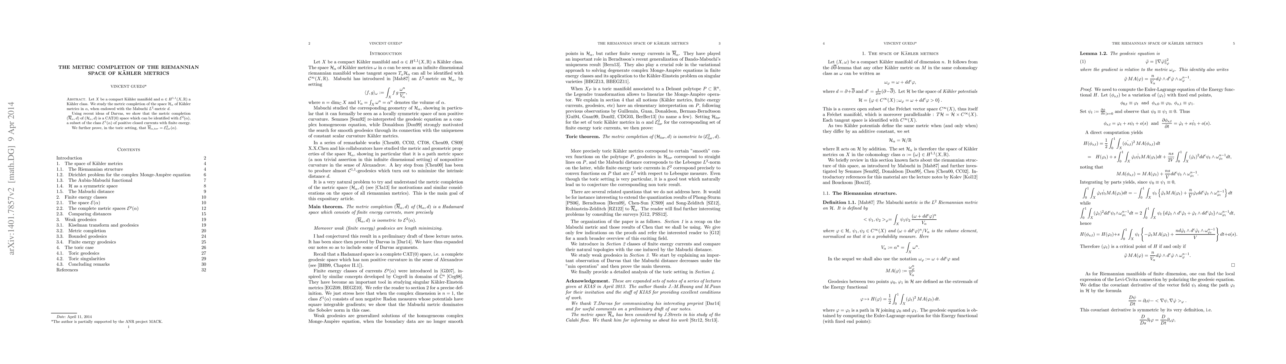 Summary: The paper studies the metric completion of the space of Kähler metrics on a compact Kähler manifold, showing it forms a CAT(0) space identified with a subset of positive closed currents with finite energy. In the toric setting, the completion is shown to match a specific subset of these currents.