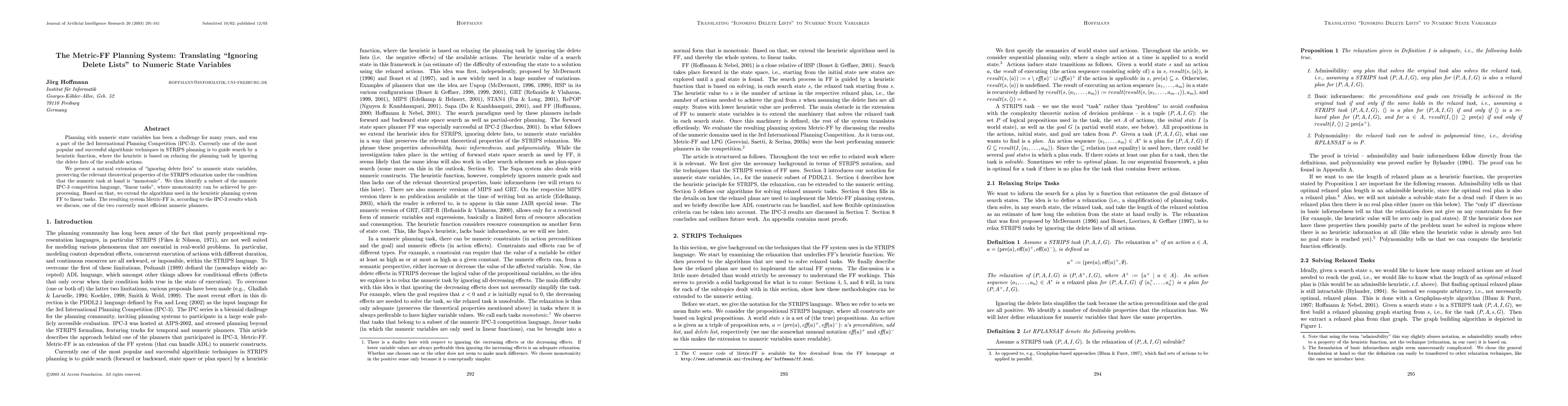 The Metric-FF planning system extends the heuristic technique of ignoring delete lists to numeric state variables, achieving efficiency in monotonic tasks through pre-processing and adapting FF algorithms. It ranks among the top numeric planners based on IPC-3 results.