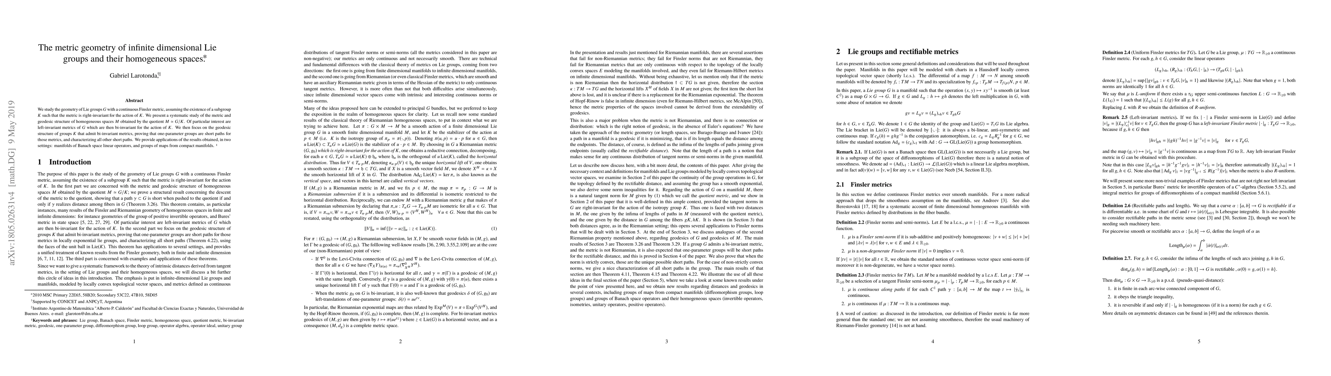 This paper investigates the metric geometry of infinite-dimensional Lie groups equipped with continuous Finsler metrics and right-invariant under a subgroup $K$. It systematically explores the metric and geodesic structure of homogeneous spaces $G/K$, particularly focusing on left-invariant metrics that become bi-invariant under $K$. It proves that one-parameter groups are short paths for these metrics and characterizes all other short paths, with applications to Banach space operators and map groups.