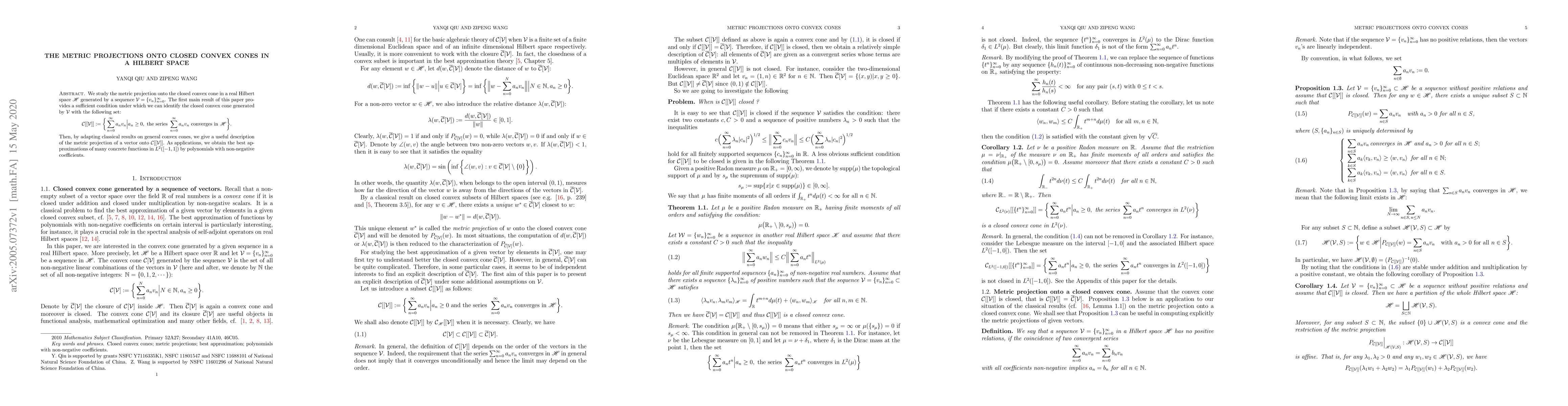 This paper investigates metric projections onto closed convex cones in a Hilbert space generated by a sequence, providing a sufficient condition to identify such cones and describing the metric projection onto them. Applications include finding best approximations of functions in $L^2([-1,1])$ by polynomials with non-negative coefficients.