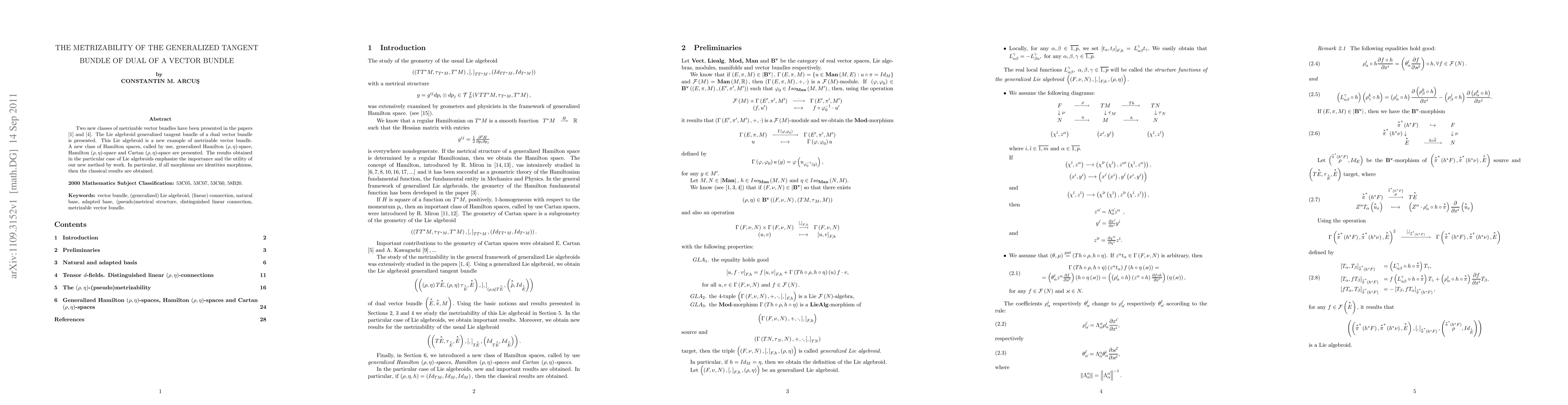 This paper introduces a new metrizable Lie algebroid generalized tangent bundle for the dual of a vector bundle, expanding on recent classes of metrizable vector bundles. It also presents generalized Hamilton spaces, emphasizing the utility of the new method, with classical results retrieved under specific conditions.