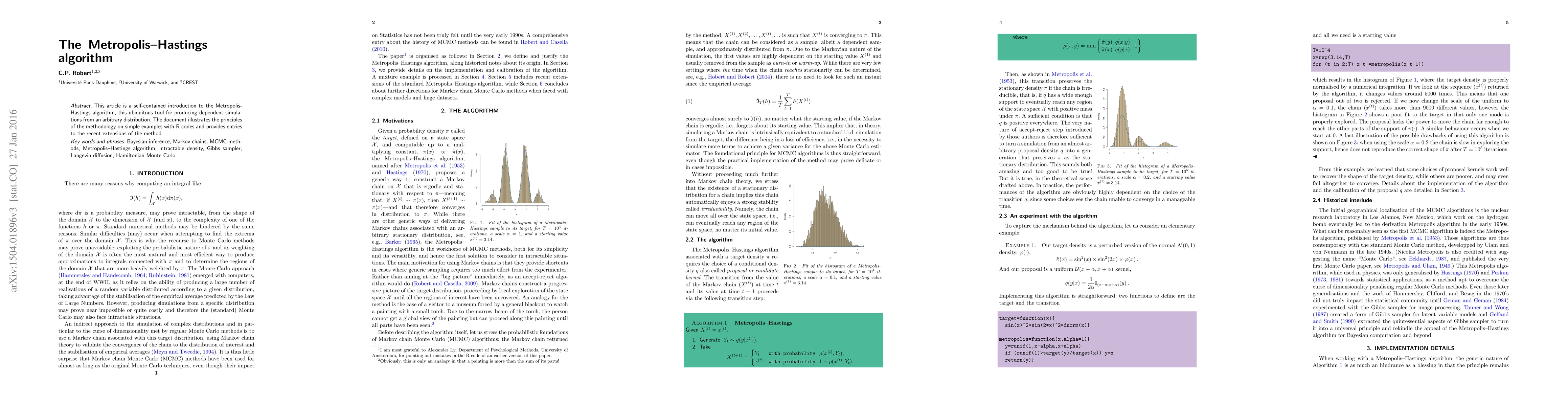 Summary: This paper introduces the Metropolis-Hastings algorithm for generating dependent simulations from arbitrary distributions, illustrated with simple examples and R code, and references recent methodological extensions.