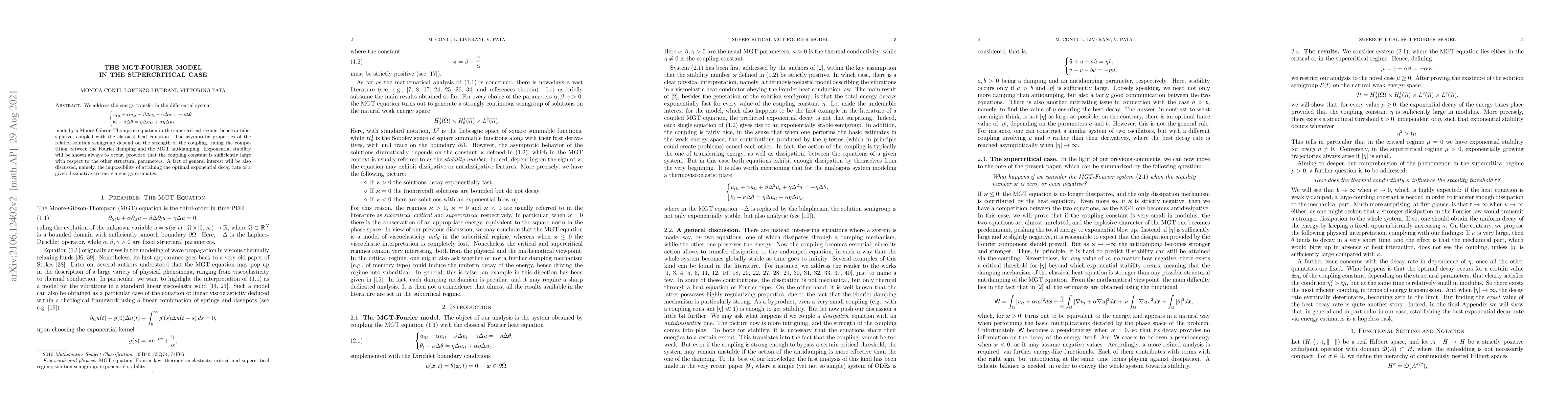We address the energy transfer in the differential system $$ \begin{cases} u_{ttt}+\alpha u_{tt} - \beta \Delta u_t - \gamma \Delta u = -\eta \Delta \theta \\ \theta_t - \kappa \Delta \theta =\eta \Delta u_{tt}+ \alpha\eta \Delta u_t \end{cases} $$ made by a Moore-Gibson-Thompson equation in the supercritical regime, hence antidissipative, coupled with the classical heat equation. The asymptotic properties of the related solution semigroup depend on the strength of the coupling, ruling the competition between the Fourier damping and the MGT antidamping. Exponential stability will be shown always to occur, provided that the coupling constant is sufficiently large with respect to the other structural parameters. A fact of general interest will be also discussed, namely, the impossibility of attaining the optimal exponential decay rate of a given dissipative system via energy estimates.
