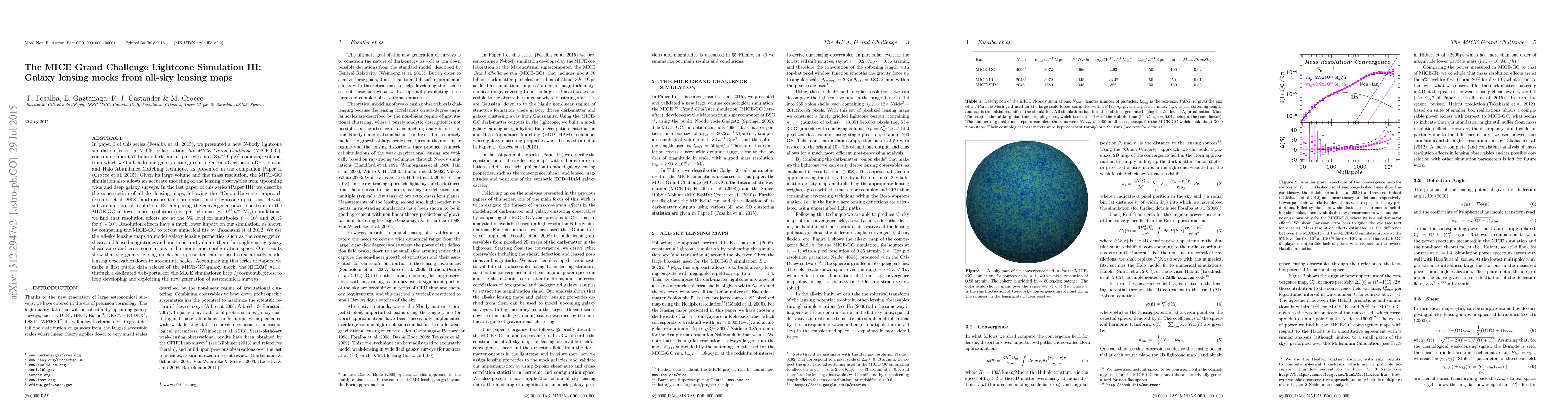 In paper I of this series (Fosalba et al. 2013), we presented a new N-body lightcone simulation from the MICE collaboration, the MICE Grand Challenge (MICE-GC), containing about 70 billion dark-matter particles in a (3 Gpc)^3 comoving volume, from which we built halo and galaxy catalogues using a Halo Occupation Distribution and Halo Abundance Matching technique, as presented in the companion Paper II (Crocce et al. 2013). Given its large volume and fine mass resolution, the MICE-GC simulation also allows an accurate modeling of the lensing observables from upcoming wide and deep galaxy surveys. In the last paper of this series (Paper III), we describe the construction of all-sky lensing maps, following the "Onion Universe" approach (Fosalba et al. 2008), and discuss their properties in the lightcone up to z=1.4 with sub-arcmin spatial resolution. By comparing the convergence power spectrum in the MICE-GC to lower mass-resolution (i.e., particle mass ~ 10^11 Msun) simulations, we find that resolution effects are at the 5 % level for multipoles l ~ 10^3 and 20 % for l ~ 10^4. Resolution effects have a much lower impact on our simulation, as shown by comparing the MICE-GC to recent numerical fits by Takahashi et al 2012. We use the all-sky lensing maps to model galaxy lensing properties, such as the convergence, shear, and lensed magnitudes and positions, and validate them thoroughly using galaxy shear auto and cross-correlations in harmonic and configuration space. Our results show that the galaxy lensing mocks here presented can be used to accurately model lensing observables down to arcminute scales.