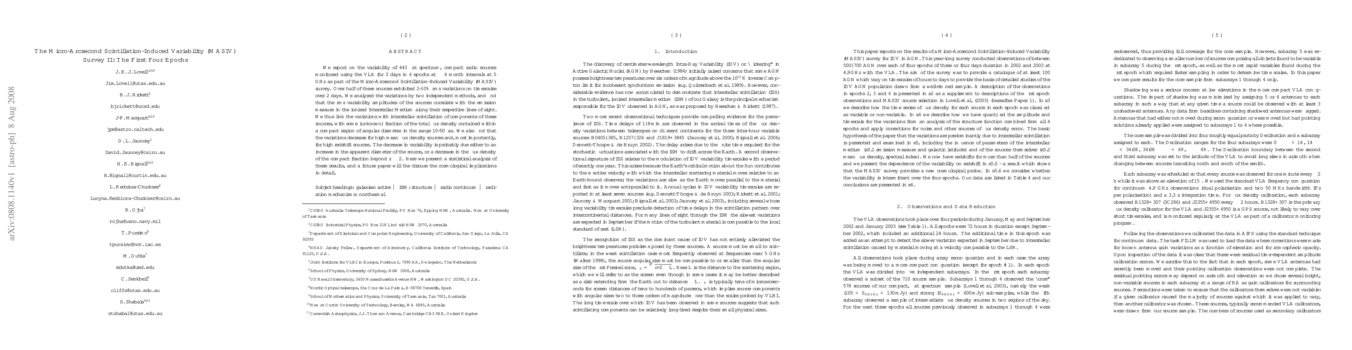 We report on the variability of 443 flat spectrum, compact radio sources monitored using the VLA for 3 days in 4 epochs at ~ 4 month intervals at 5 GHz as part of the Micro-Arcsecond Scintillation-Induced Variability (MASIV) survey. Over half of these sources exhibited 2-10% rms variations on timescales over 2 days. We analyzed the variations by two independent methods, and find that the rms variability amplitudes of the sources correlate with the emission measure in the ionized Interstellar Medium along their respective lines of sight. We thus link the variations with interstellar scintillation of components of these sources, with some (unknown) fraction of the total flux density contained within a compact region of angular diameter in the range 10-50 micro-arcseconds. We also find that the variations decrease for high mean flux density sources and, most importantly, for high redshift sources. The decrease in variability is probably due either to an increase in the apparent diameter of the source, or a decrease in the flux density of the compact fraction beyond z ~ 2. Here we present a statistical analysis of these results, and a future paper will the discuss the cosmological implications in detail.