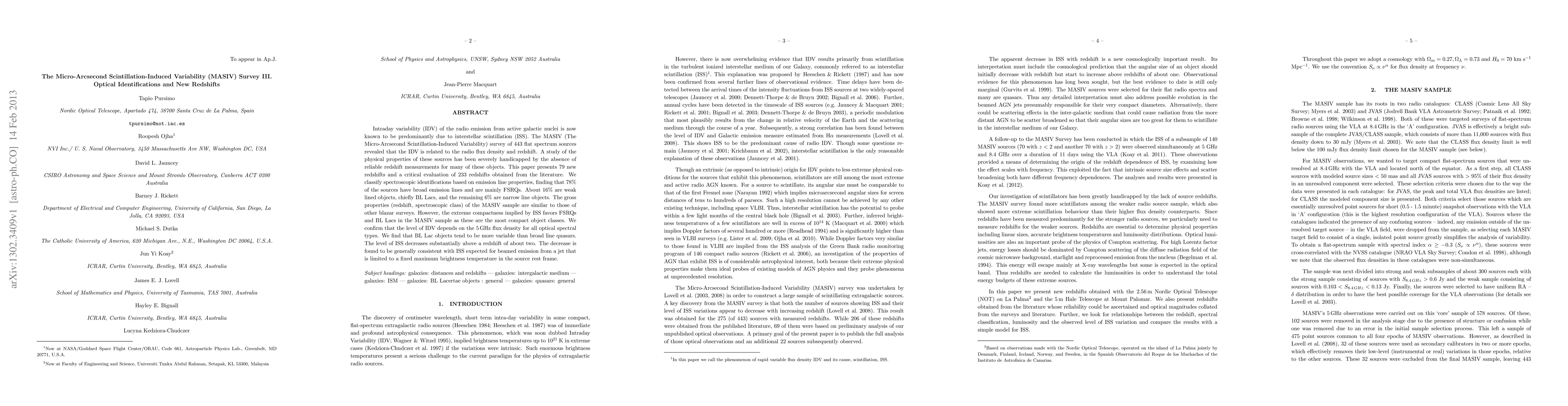 Intraday variability (IDV) of the radio emission from active galactic nuclei is now known to be predominantly due to interstellar scintillation (ISS). The MASIV (The Micro-Arcsecond Scintillation-Induced Variability) survey of 443 flat spectrum sources revealed that the IDV is related to the radio flux density and redshift. A study of the physical properties of these sources has been severely handicapped by the absence of reliable redshift measurements for many of these objects. This paper presents 79 new redshifts and a critical evaluation of 233 redshifts obtained from the literature. We classify spectroscopic identifications based on emission line properties, finding that 78% of the sources have broad emission lines and are mainly FSRQs. About 16% are weak lined objects, chiefly BL Lacs, and the remaining 6% are narrow line objects. The gross properties (redshift, spectroscopic class) of the MASIV sample are similar to those of other blazar surveys. However, the extreme compactness implied by ISS favors FSRQs and BL Lacs in the MASIV sample as these are the most compact object classes. We confirm that the level of IDV depends on the 5\,GHz flux density for all optical spectral types. We find that BL Lac objects tend to be more variable than broad line quasars. The level of ISS decreases substantially above a redshift of about two. The decrease is found to be generally consistent with ISS expected for beamed emission from a jet that is limited to a fixed maximum brightness temperature in the source rest frame.