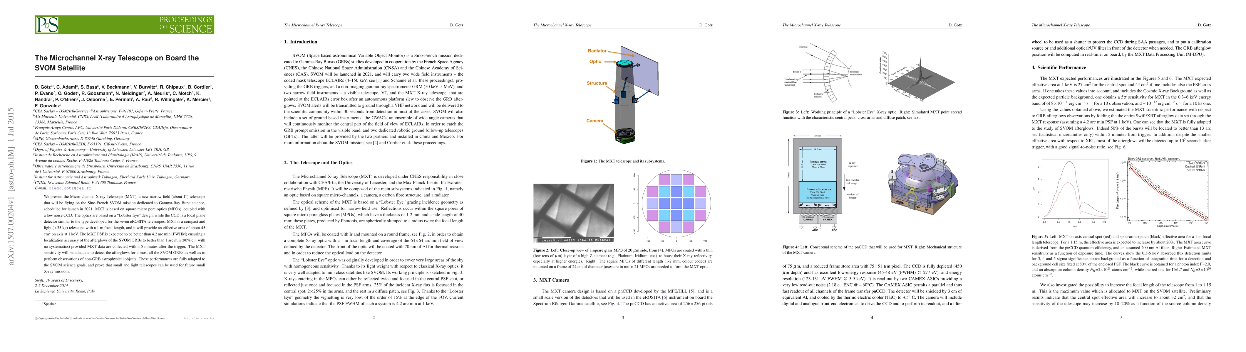 The Micro-channel X-ray Telescope (MXT) on the SVOM satellite employs micro-pore optics and a low-noise CCD to provide compact, high-sensitivity X-ray imaging for Gamma-Ray Burst science, with a PSF better than 4.2 arc min and effective area of 45 cm² at 1 keV.