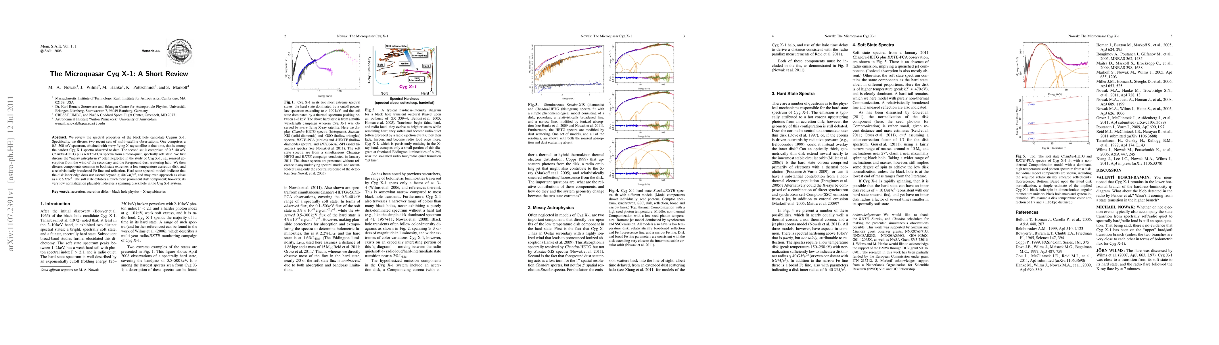 The paper reviews spectral properties of black hole candidate Cygnus X-1, highlighting key findings including ionized absorption, relativistically broadened Fe lines, and a spinning black hole in the soft state.