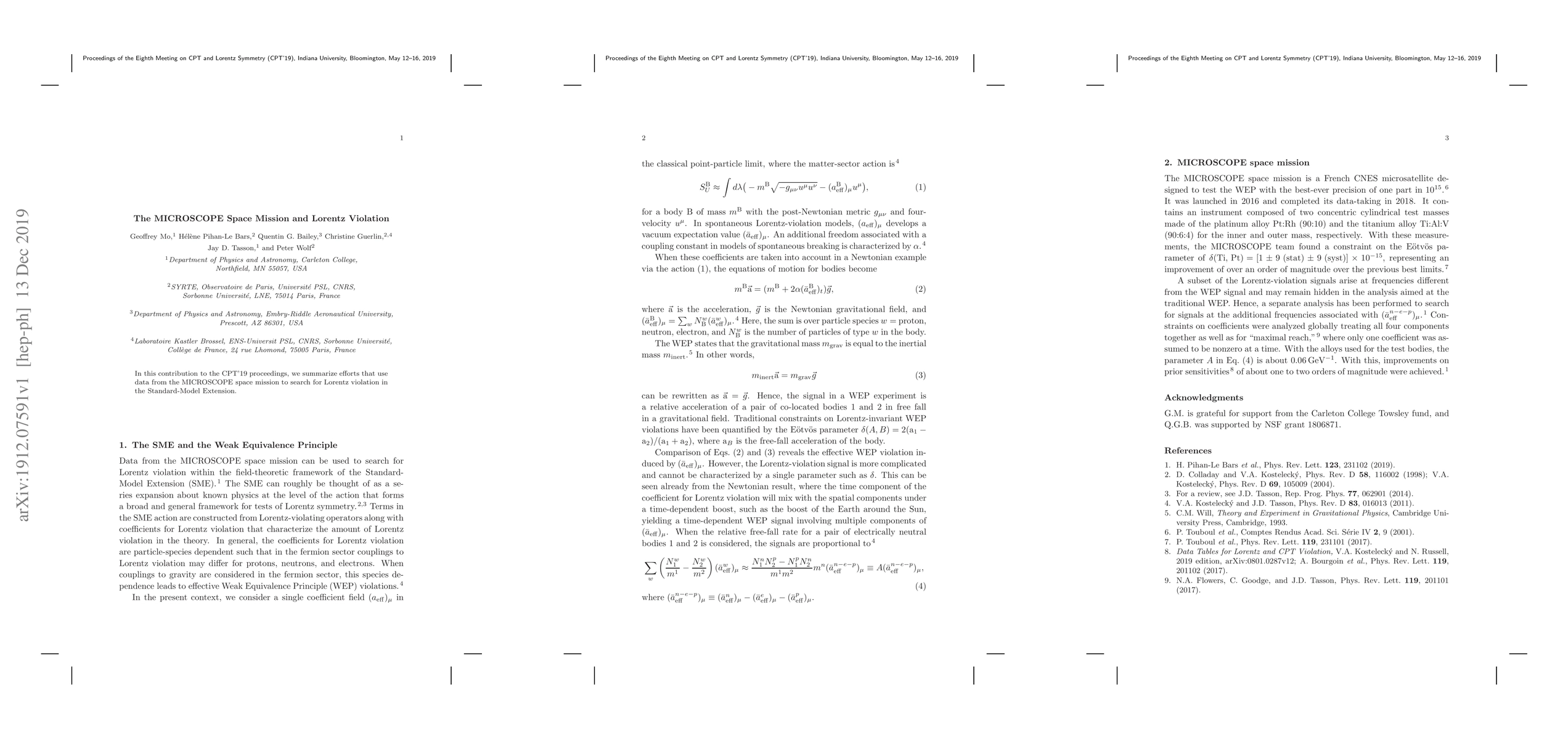 Summary: This paper reviews the MICROSCOPE space mission's data analysis to detect potential Lorentz violations within the Standard-Model Extension framework, contributing to the CPT'19 conference proceedings. The study aims to identify any deviations from the standard Lorentz invariance that could hint at new physics.