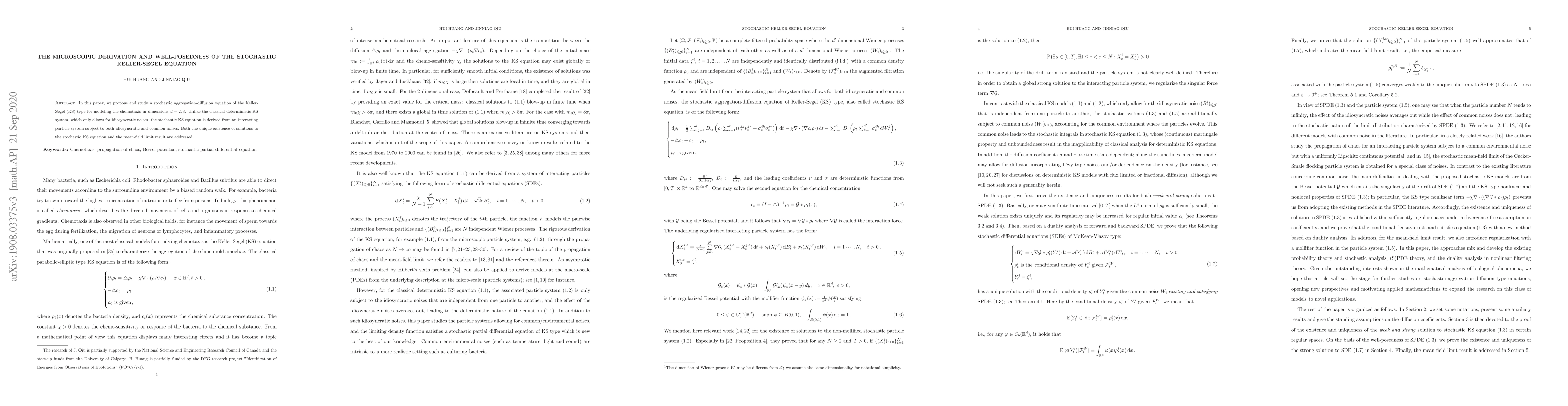 In this paper, we propose and study a stochastic aggregation-diffusion equation of the Keller-Segel (KS) type for modeling the chemotaxis in dimensions $d=2,3$. Unlike the classical deterministic KS system, which only allows for idiosyncratic noises, the stochastic KS equation is derived from an interacting particle system subject to both idiosyncratic and common noises. Both the unique existence of solutions to the stochastic KS equation and the mean-field limit result are addressed.