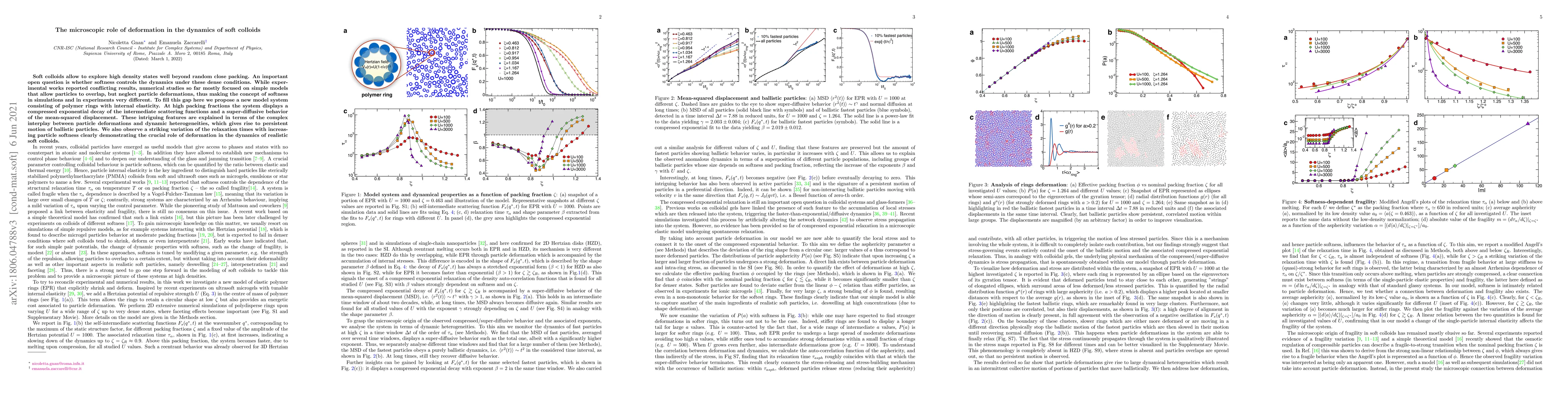 Soft colloids allow to explore high density states well beyond random close packing. An important open question is whether softness controls the dynamics under these dense conditions. While experimental works reported conflicting results, numerical studies so far mostly focused on simple models that allow particles to overlap, but neglect particle deformations, thus making the concept of softness in simulations and in experiments very different. To fill this gap here we propose a new model system consisting of polymer rings with internal elasticity. At high packing fractions the system displays a compressed exponential decay of the intermediate scattering functions and a super-diffusive behavior of the mean-squared displacement. These intriguing features are explained in terms of the complex interplay between particle deformations and dynamic heterogeneities, which give rise to persistent motion of ballistic particles. We also observe a striking variation of the relaxation times with increasing particle softness clearly demonstrating the crucial role of particle deformation in the dynamics of realistic soft colloids.