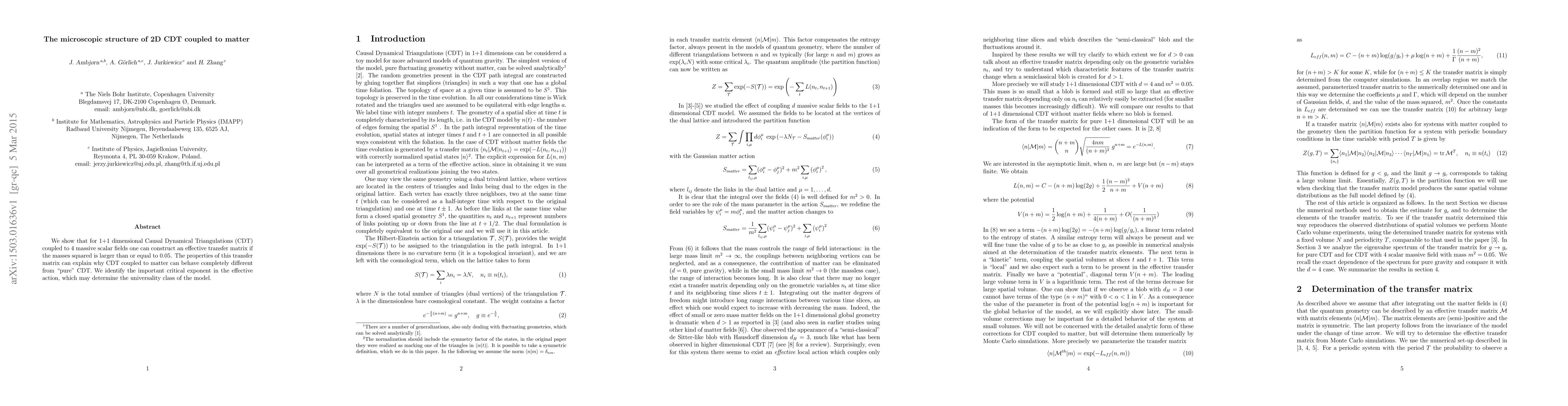 We show that for 1+1 dimensional Causal Dynamical Triangulations (CDT) coupled to 4 massive scalar fields one can construct an effective transfer matrix if the masses squared is larger than or equal to 0.05. The properties of this transfer matrix can explain why CDT coupled to matter can behave completely different from "pure" CDT. We identify the important critical exponent in the effective action, which may determine the universality class of the model.