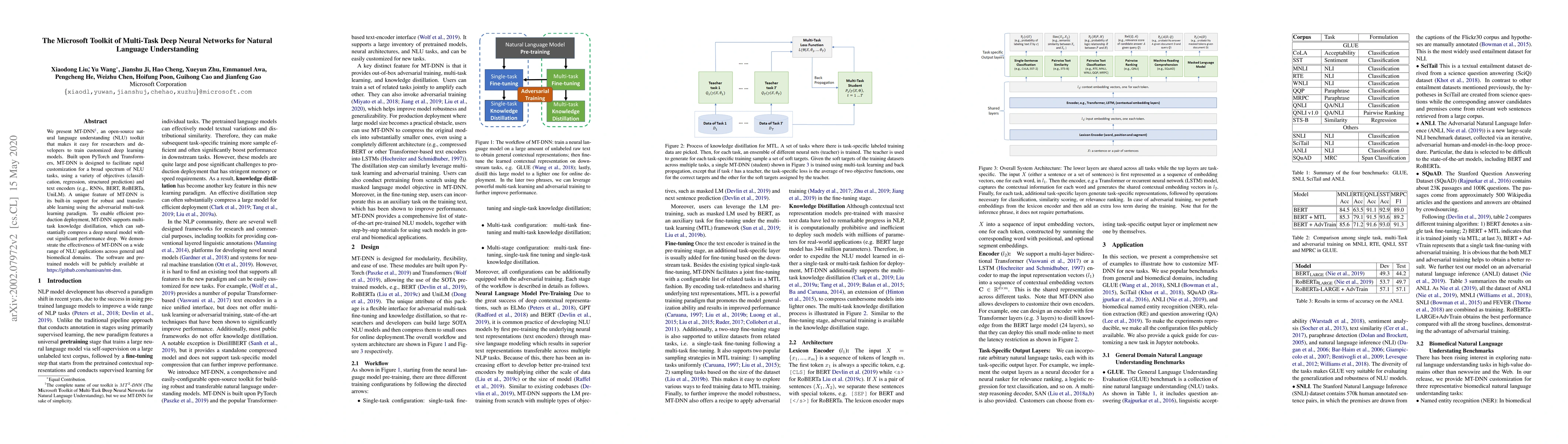 MT-DNN is an open-source toolkit for natural language understanding that simplifies training customized deep learning models using various objectives and text encoders. It supports multi-task learning and knowledge distillation, enabling efficient deployment and performance retention.