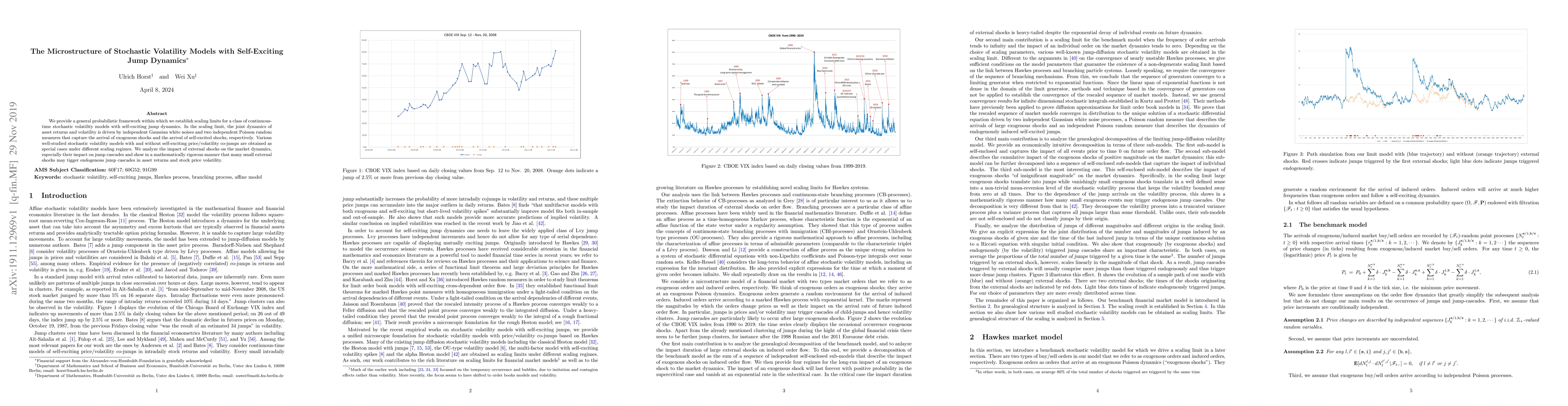 This paper develops a probabilistic framework for scaling limits of stochastic volatility models with self-exciting jump dynamics, showing how external shocks can trigger endogenous jump cascades in asset returns and volatility. The framework captures the joint dynamics driven by Gaussian noise and Poisson processes for exogenous and self-excited shocks.