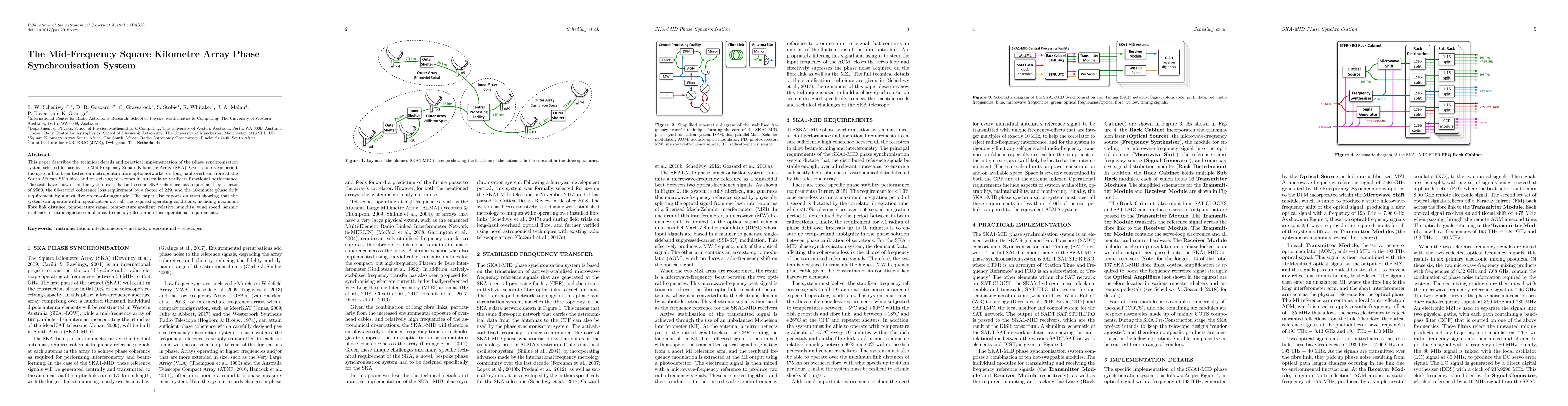 This paper describes the technical details and practical implementation of the Mid-Frequency Square Kilometre Array (SKA) phase synchronisation system. Over a four-year period, the system has been tested on metropolitan fibre-optic networks, on long-haul overhead fibre at the South African SKA site, and on existing telescopes in Australia to verify its functional performance. The tests have shown that the system exceed the 1-second SKA coherence loss requirement by a factor 2560, the 60-second coherence loss requirement by a factor of 239, and the 10-minute phase drift requirement by almost five orders-of-magnitude. The paper also reports on tests showing that the system can operate within specification over the all required operating conductions, including maximum fibre link distance, temperature range, temperature gradient, relative humidity, wind speed, seismic resilience, electromagnetic compliance, frequency offset, and other operational requirements.