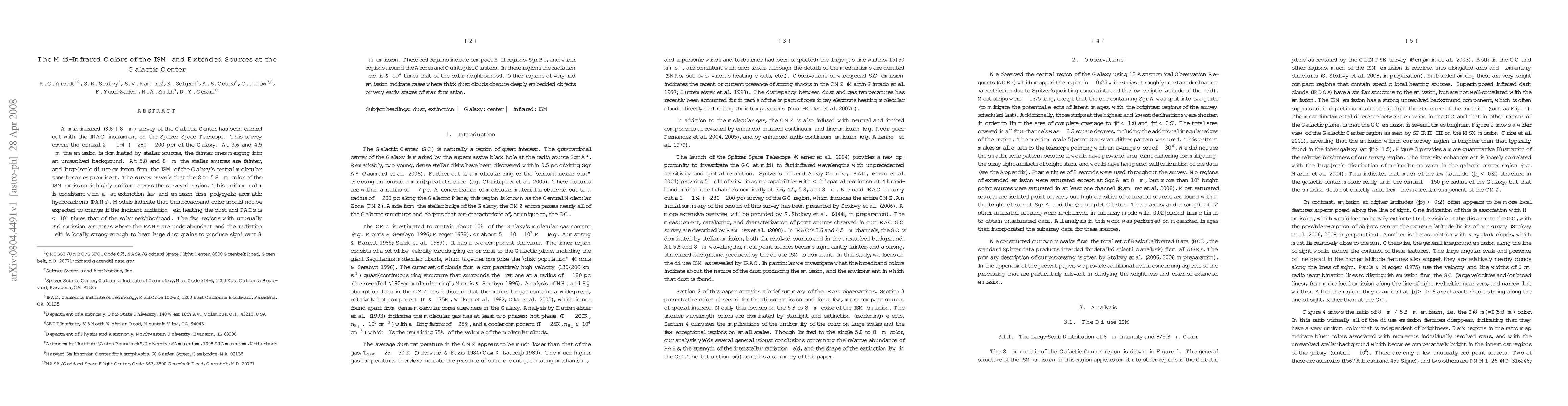 This mid-infrared survey of the Galactic Center using the Spitzer Space Telescope reveals that the interstellar medium (ISM) exhibits a uniform 8 to 5.8 um color, consistent with polycyclic aromatic hydrocarbons (PAHs) and a flat extinction law. Regions with unusually red emission, such as compact H II regions and areas around the Arches and Quintuplet Clusters, indicate strong local radiation fields exceeding 10^4 times that of the solar neighborhood.