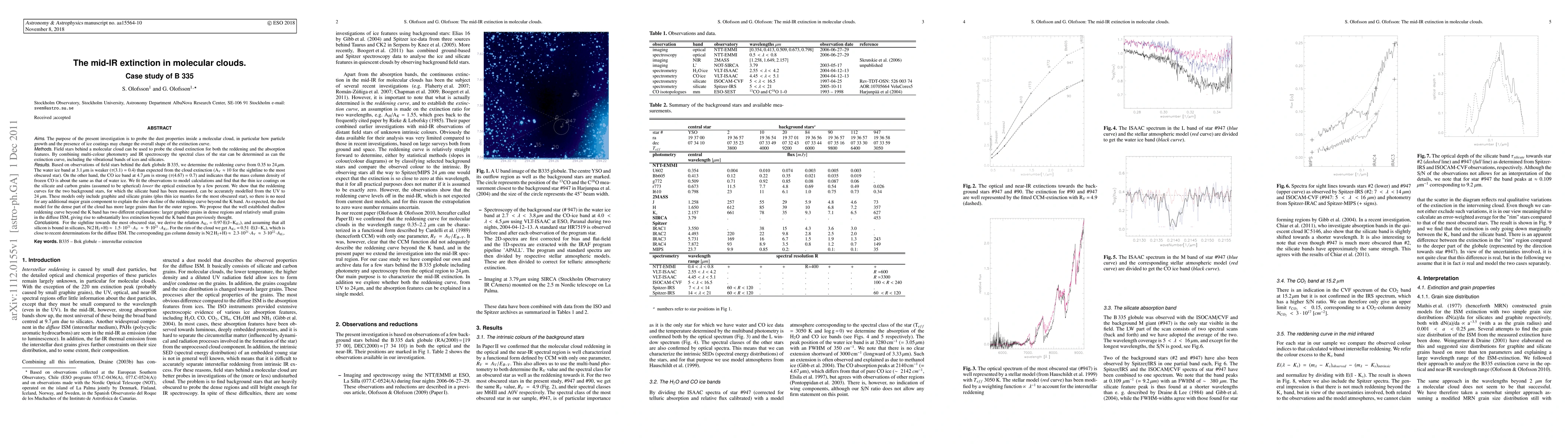 The purpose of the investigation is to probe the dust properties inside a molecular cloud, how particle grow and how the presence of ice coatings may change the overall shape of the extinction curve. Field stars can be used to probe the cloud extinction. By combining multi-colour photometry and IR spectroscopy the spectral class of the star can be determined as can the extinction curve. We determine the reddening curve from 0.35 to 24 \mu m. The water ice band at 3.1 \mu m is weaker (\tau(3.1) = 0.4) than expected from the cloud extinction (AV \approx 10 for the sightline to the most obscured star). On the other hand, the CO ice band at 4.7 \mu m is strong (\tau(4.67) = 0.7) and indicates, that the mass column density of frozen CO is about the same as that of water ice. We show that the reddening curves for the two background stars, for which the silicate band has been measured, can be accurately modelled from the UV to 24 \mu m. These models only include graphite and silicate grains. No need for any additional major grain component to explain the slow decline of the reddening curve beyond the K band. The dust model for the dense part of the cloud has more large grains than for the rim. We propose that the well established shallow reddening curve beyond the K band has two different explanations: larger graphite grains in dense regions and relatively small grains in the diffuse ISM, giving rise to substantially less extinction beyond the K band than previously thought. For the sight line towards the most obscured star, we derive the relation AKs = 0.97 \cdot E(J - Ks), and assuming that all silicon is bound in silicates, N(2 H2 +H) \approx 1.5 \times 10^{21} \cdot AV \approx 9 \times 10^{21} \cdot AKs. For the rim of the cloud we get AKs = 0.51 \cdot E(J - Ks), which is close to recent determinations for the diffuse ISM. The corresponding gas column density is N(2 H2 +H) \approx 2.3 \times 10^{21} \cdot AV \approx 3 \times 10^{22} \cdot AKs.